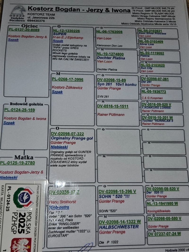 Rodzeństwo tego gołębia bardzo dobrze spisuje się w naszej hodowli. Gołębie lotowane są na dystansach od 100-800km. W sezonie 2025 wylatały 28. przodownika Polski w kat.B. Więcej wyników dostępne na stronie Oddziału Katowice.