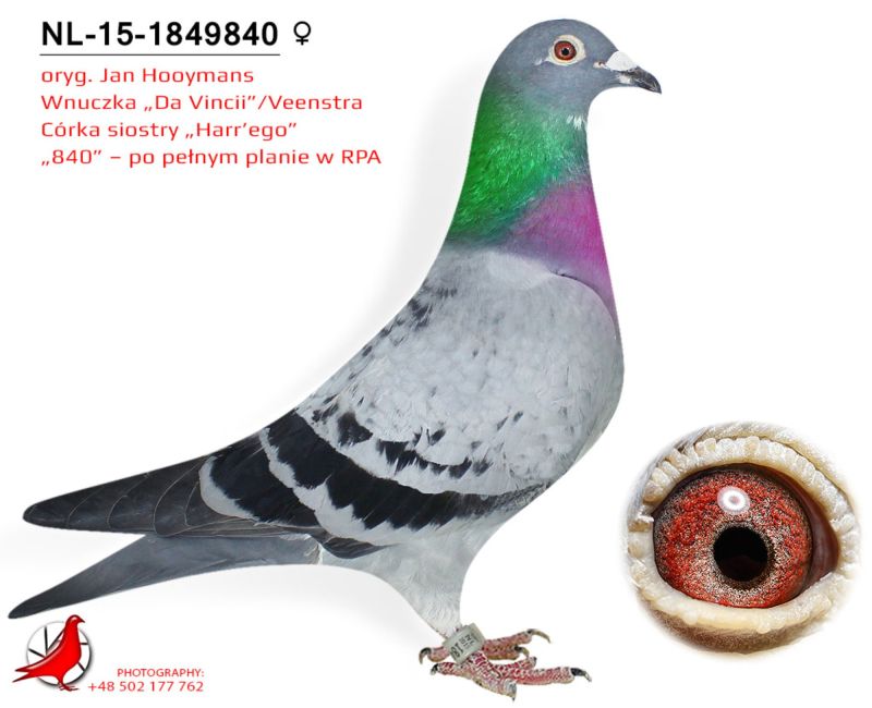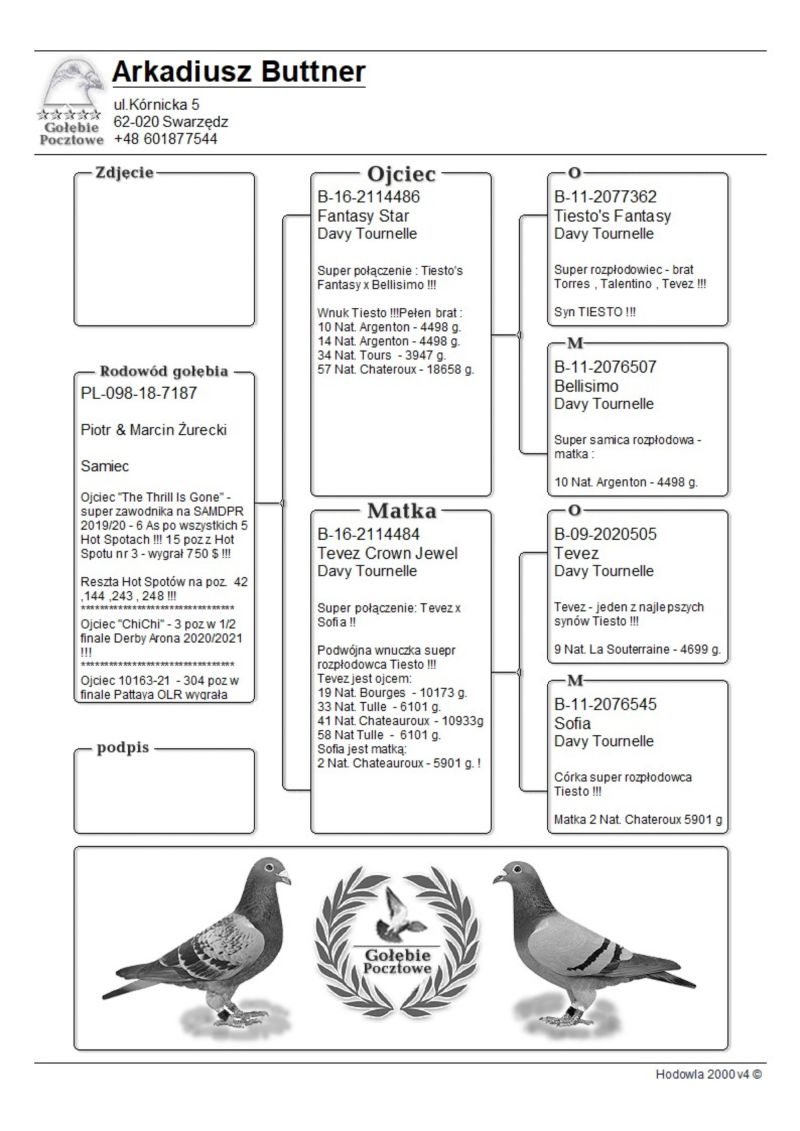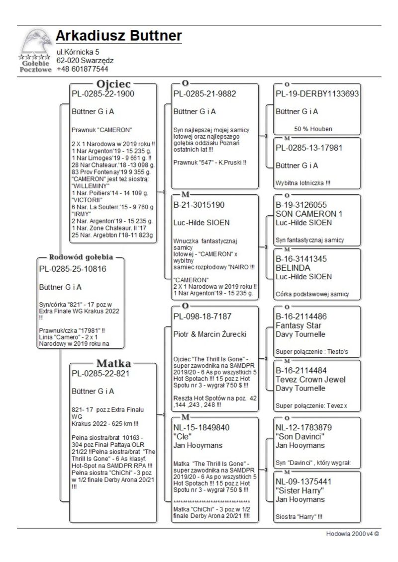 Fajniutka samiczka SUPER NA WG matka sama zajęła super pozycję (17) na Super Finale na Krakusie w 2022r. a ze strony ojca brat 17981 (mojej najlepszej samicy lotowej w historii) - 17773 wygrał finał Ostseerennen 2013 a 1133693 to 1/2 brat Agnes - 35 poz w finale SAMDPR w RPA. Do tego linia Cameron jednej z najlepszych samic świata - 2 x 1 Narodowy w 2019r. na ponad 9 i 15 tyś gołębi - sprzedana za 800 0000 Euro do Chin ! "The Thrill is Gone"(Hooymans x Tournelle) - 6 As Hot Spotów na ostatniej edycji SAMDPR - była to najwyższa lokata polskiego gołębia w historii imprezy 42 ,144 ,243 , 248 pozycje w Hot Spotach na kilka grubych tysięcy gołębi , Siostra 821-22 była 17 w Extra Finale WG Krakus 2022 , kolejna siostra 3 poz w 1/2 finale Derby Arona 2020/2021 , kolejne rodzeństwo Ojciec 10163-21 - 304 poz w finale Pattaya OLR wygrała 1200 $ oraz współzdobywczyni 5 "Małej Drużyny" , która wygrała 2000 $ ! 17981 - kat B 2016 - 14.10 coeff - 3 lotnik okręgu i 10 lotnik regionu VI 1 As oddz kat open 2017 - 13 konk !!! 1 As oddz kat A 2017 !! 1 As oddz kat D 2017 !! 1,2,7,8,13,13....konk !! 2018 5 As oddz kat B !! 2019 1 As oddz kat D !!! 4 As oddz kat "open"!!! 5 As oddz kat C!!! 2020 4 As oddz kat "Open" !! 1 As samica oddzaiału !! 1 As oddz kat C !! 1 As oddz kat D !! 7 As oddz kat A ! 17981 - to też pełna siostra 17773 - wygrał finał WG Ostseerennen - 24 minuty wyprzedzenia - wygrał 12 000 Euro !.....od 2017 roku 30x mistrzostwo oddz w różnych kategoriach w tym 2019-2021 3 x z rzędu supermistrzostwo oddziału Poznań, więcej info 601 877 544