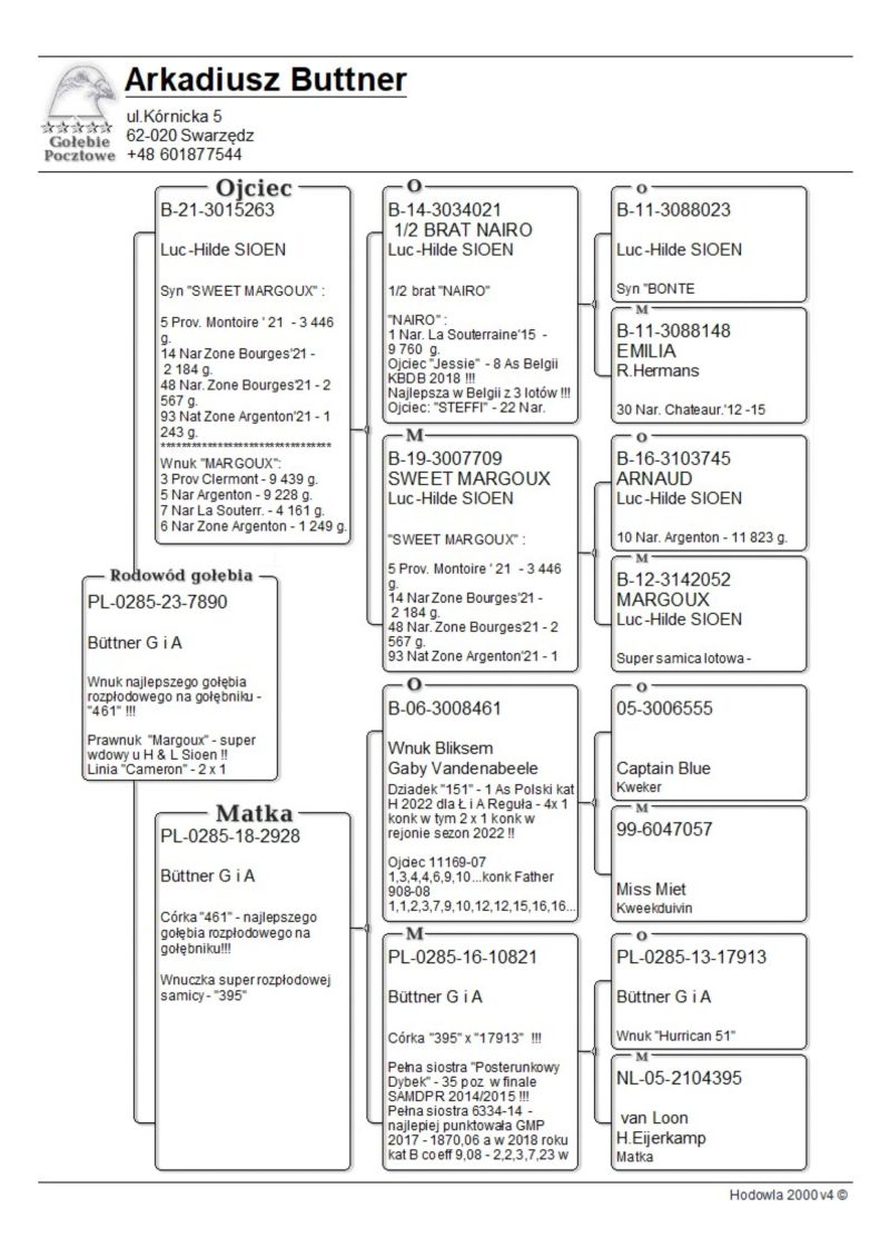 Extra samczyk - wnuk mojego najlepszego samca rozpłodowego na gołębniku - "461". Ojciec to oryginał z topowej belgijskiej hodowli Luc & Hilda Sioen bazującej na gołębiach Willem de Bruijn ! "395" - Matka 4570-06,1626-07,1890-07,8218-09,8121-09,8122-09 które zdobyły wiele czołowych konk: 1,1,2,3,3,4,4,5,6,7,9,9,9.. Matka "Posterunkowy Dybek"- 35 miejsce w finale SAMDPR 2015 !! Babcia "Chase" - 278 poz w finale SAMDPR 2018/2019 !!! Matka 6334 - super lotniczka 2017 2 As oddz kat B coeff. 39,52 ! 2018 4 As okręgu kat B - coeff: 9,08 !!! 2,3,5,7,7,11,12,15 konk w oddz oraz wielu wielu innych !! "17913" (syn 1215)- najlepszy mój samiec rozpłodowy jeżeli chodzi o WG i nie tylko samiczka 6334-14 najlepiej punktowała mi do GMP 2017 kiedy udało się zdobyć XII miejsce w Polsce. Samiczka jest też właśnie wnuczką 1215 , z którego wywodzą się z ....8,25(dla Kol.Chłopeckiego) , 35 , 130 ,231 , 263 , 277 , 278 gołąb w finale SAMDPR w RPA wywodził się z 1215 ...szczególnie ta czołówka wydaje mi się , że jest imponująca ...nie wiele jest takich linii , które potrafią takie coś zrobić... po bracie 17913 - 15978 był też w 2020 roku 5 gołąb w finale WG Krakus . "2644" (podwójna wnuczka "17913") - babka 2 super samic Lotowych u Kol Kazimierza Goździejewskiego ( jedna w kat M w 2023 roku miała coeff 4,84 a druga w 2024 roku 2,58 - 2 x 1 na oddział - w kat "I" - coeff 9 z haczykiem) "461" najważniejsze referencje z 2025/2026 roku: Prawnuk - 5110- Kolegi Jacka Orszulika 2 As Polski kat A -olimpijczyk z Dortmundu 2026 !! z 2024 roku: 1 As Rejonu z 8 lotów rejonowych - prawnuczka 461 u Kol Adama Gasperowicza, prawnuk "461" wygrał finał na WG Podhale wygrywając 50 000 dla Kolegi Bogdana Bieli !- liczba jedynek jego wnuków , prawnuków i oczywiście dzieci będzie około stu a kilkadziesiąt gołębi z 461 zajmowało top 10 w kat As w różnych kategoriach w różnych okręgach w Polsce- tylko w 2022 roku w 9 różnych oddziałach przeważnie prawnuki zdobywały 1 lokatę w oddz !!! Jego wnuczka została też na olimpiadzie w tym roku 4 gołębiem świata w kat H dla Kol Łukasza Reguły. !! Na screenie przykład jak potrafią siadać gołębie w oddz z linii 461 ... 3-prawnuk,4 -wnuk , 5-wnuk , 6 - roczna wnuczka - kat A 9 z groszem ma , 7 wnuk , 11 - wnuk oraz 15 - wnuk 461. oraz kolejny lot z 2020 roku : 1,2,3,5,7,8 wnuk oraz 15 prawnuk ? do tego roczna samiczka Kolegów Piotra I Marcina Żureckich z Kępna została 6 asem Polski w kat G ...tak leciała... 2 na 5200 g ze 174 km 8 na 4573 z 219 km 8 na 3583 g z 324 km 8 na 1764 g z 324 g 21 na 4535 g z 549 km - rej - coeff jak widać na zdjęciu 13,54 miała też szósty super lot była 25 na 4984 g coeff 5,02 1 goląb z Extra finału na WG Giewont 2022 dla Teamu Chudy-Molek to też linia "461" ojciec to syn mojej super wdowy 2161-12 ,, Dwie Prawnuczki .... u Kol Kazimierza Goździejewskiego ( jedna w kat M w 2023 roku miała coeff 4,84 ( 1 as okręgu Wałbrzych a druga w 2024 roku 2,58 - 2 x 1 na oddział (2 as Polski kat M w/g miesięcznika "Hodowca") - w kat "I" - coeff 9 z haczykiem), "461" to też pradziadek PL-0122-22-2219 - w 2 sezony na 21 wkładań 20 konkursów - kat A coeff 9,08 a z dwóch lat do wystaw kat A-74,86 , kat B-65,94 a kat D-72,20 W 2023 roku zdobył 1 konk na ok 4100 gołębi z miejsc Sulechów a w 2024 roku 2 x 2 konk w oddz !!! oraz pradziadek PL-0122-22-5510 w kat A w 2024 roku uzyskał coeff. 4,75 Zdobył też 1 konk na oddz z miejsc. Brzeg Dolny na 4322 gołębie !! Został też 4 Asem Polski kat krótki dystans 2024 z coeff 17 z groszem z 5 lotów do kat A właśnie dla Kolegi Jacka Orszulika !!! oraz wiele,wiele innych.....od 2017 roku 30x mistrzostwo oddz w różnych kategoriach w tym 2019-2021 3 x z rzędu supermistrzostwo oddziału Poznań, więcej info 601 877 544