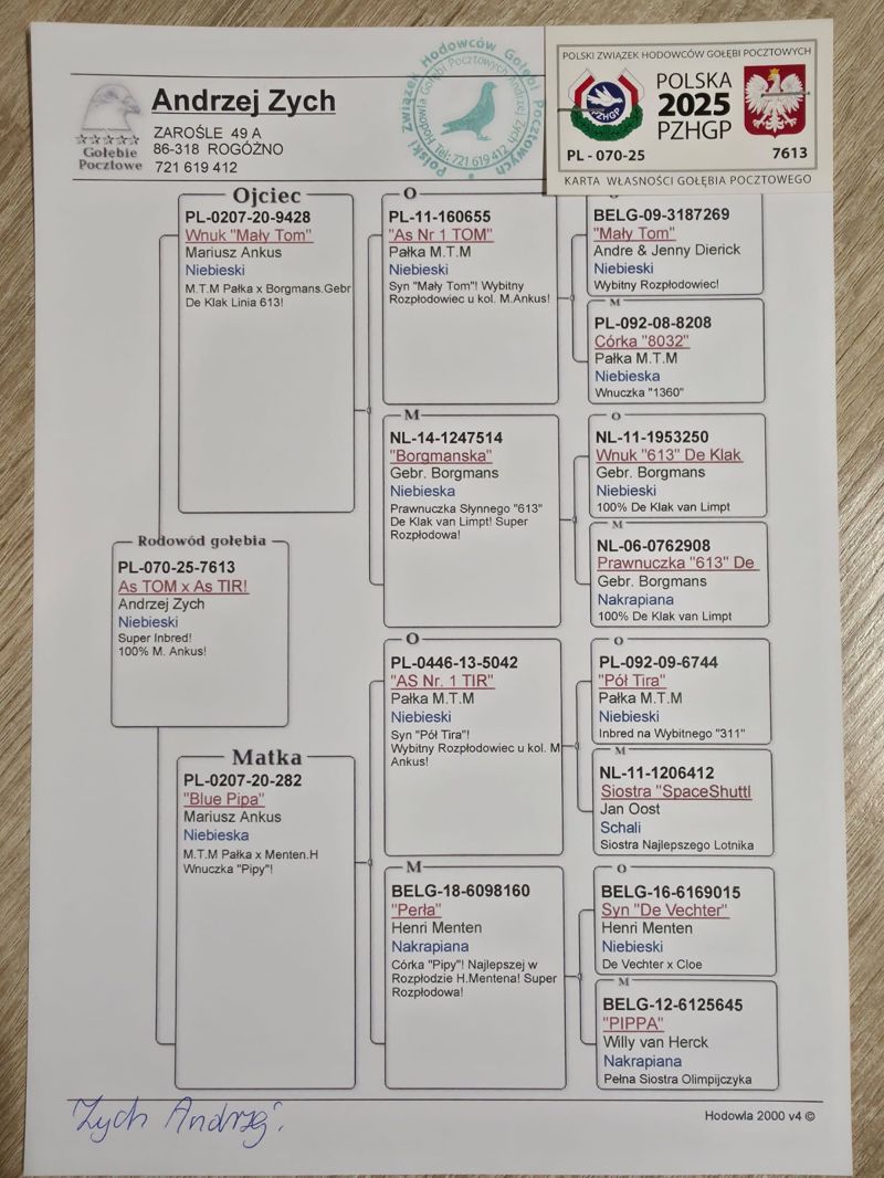 Oryginalny gołąb z hodowli Andrzeja Zycha. Szczegóły pochodzenia zamieszczone w rodowodzie. Więcej informacji pod numerem telefonu: 721 619 412