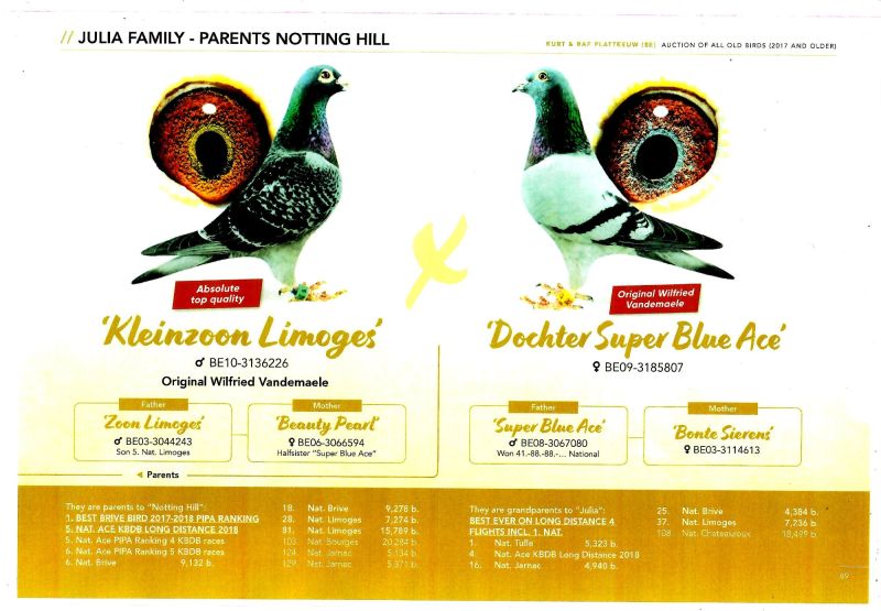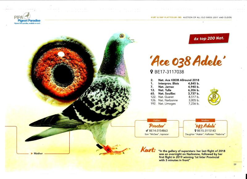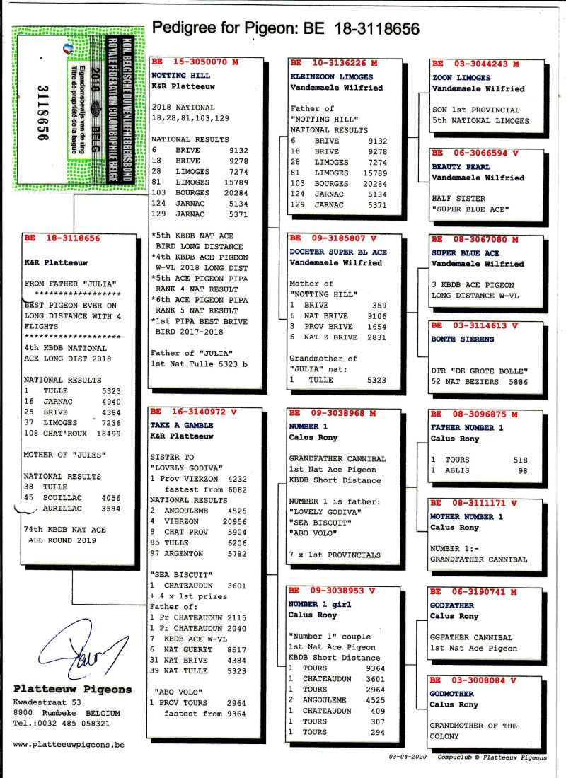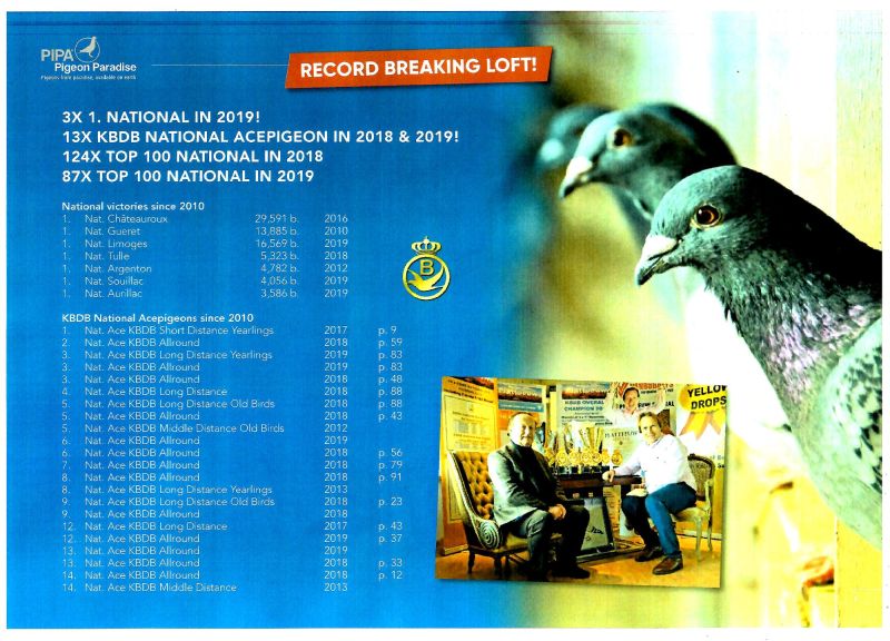 Wystarczy spojrzeć na ich listę osiągnięć, aby zrozumieć, że rodzina Platteeuw praktycznie dominuje w zawodach krajowych. A co z ich listą osiągnięć z 2019 roku: ich stare ptaki i roczniaki zostały zakoszowane w 9 krajowych lotach długodystansowych, w których drużyna Platteeuw zdobyła 3 pierwsze miejsca w kraju, a w 7 z 9 wyścigów uplasowała się w pierwszej dziesiątce! Dodatkowo, w ciągu dziewięciu tygodni odnieśli 7 zwycięstw na szczeblu prowincjonalnym.A jeśli zsumujemy wyniki z 2018 i 2019 roku, otrzymamy oszałamiające liczby: 4 razy pierwsze miejsce w kraju, 13 krajowych asów KBDB i… 211 miejsc w pierwszej setce w kraju! Odnieśli również podwójne zwycięstwo w ważnym klasyku w obu sezonach: 1. i 2. miejsce w Tulle w 2018 roku oraz 1. i 2. miejsce w Limoges w 2019 roku.Zespół Platteeuw ma w swojej kolekcji imponującą serię gołębi narodowych asów KBDB