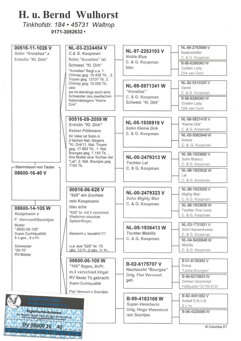 Oryginalny gołab z hodowli H.u.Bernd Wulhorst. Sprzedaż spowodowana brakiem czasu i redukcją stada. Szczegóły pochodzenia w rodowodzie. Więcej informacji pod nr tel.: 694 384 684