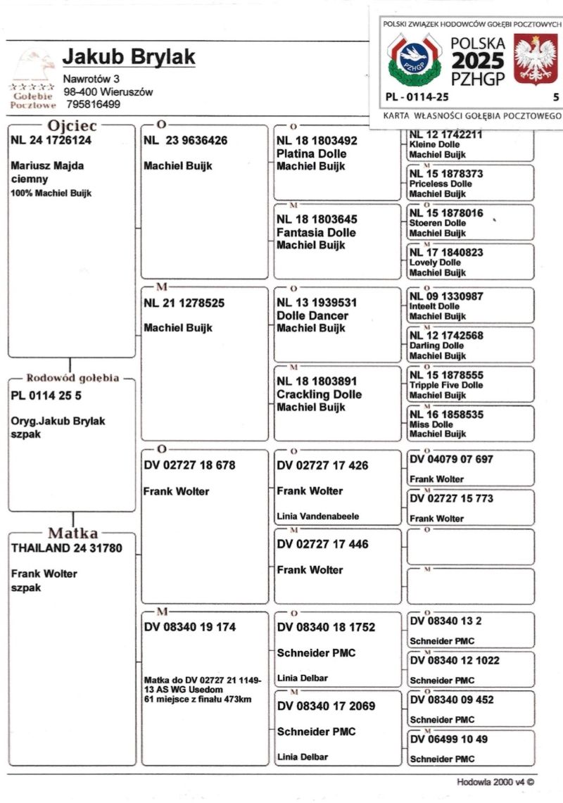 Oryginalny gołąb z hodowli Jakub Brylak. Szczegóły pochodzenia w rodowodzie. Więcej informacji pod nr tel.795 816 499 Dostawa gołębi będzie realizowana po zakończeniu aukcji kurierem lub odbiór osobisty.