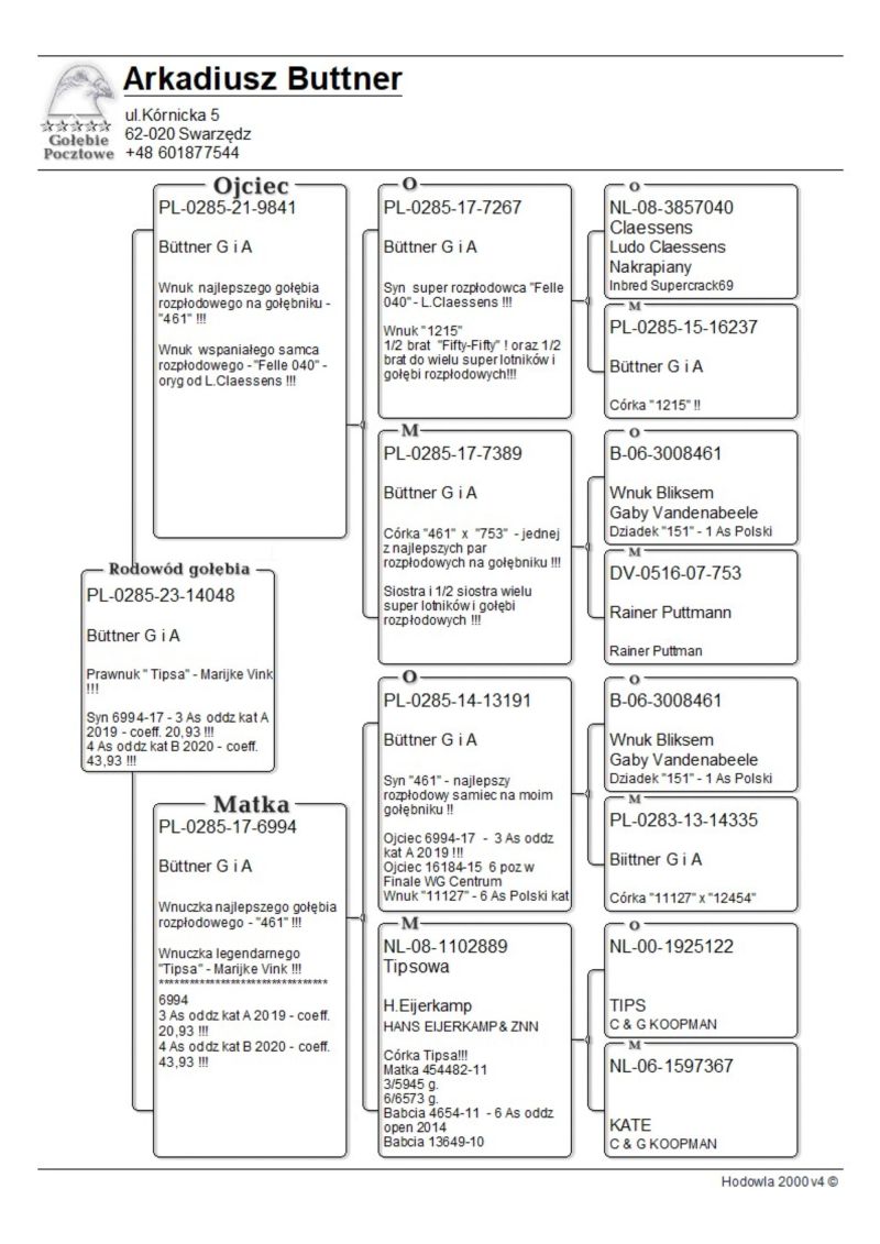 samczyk (zdjęcie robione rok temu kiedy był roczny) - syn super wdowy 3 i 4 asa oddz kat A i B 2019 i 2020. Pokrewieństwo na mojego najlepszego samca rozpłodowego na gołębniku "461". Wnuk Tipsowej a prawnuk legendarnego "Tipsa" - Marijke Vink - w rodowdzie "Tipsowej" można zobaczyć wyniki dzieci Tipsa. Linia "1215" !! "Tipsowa" - babka m.in 8755 , który dla Kol . Krzyśka Kusia wylatał 4 wynik w Polsce w kat olimpijskie E i był gołębiem rezerwowym na olimpiadę. Matka "6994" 3 i 4 as oddz kat A i B Matka i babcia wielu super gołębi rozpłodowych ! "17913" (syn 1215)- najlepszy mój samiec rozpłodowy jeżeli chodzi o WG i nie tylko samiczka 6334-14 najlepiej punktowała mi do GMP 2017 kiedy udało się zdobyć XII miejsce w Polsce. z 1215 wywodzą się też.....8,25(dla Kol.Chłopeckiego) , 35 , 130 ,231 , 263 , 277 , 278 gołąb w finale SAMDPR w RPA wywodził się z 1215 ...szczególnie ta czołówka wydaje mi się , że jest imponująca ...nie wiele jest takich linii , które potrafią takie coś zrobić... po bracie 17913 - 15978 był też w 2020 roku 5 gołąb w finale WG Krakus . "2644" (podwójna wnuczka "17913") - babka 2 super samic Lotowych u Kol Kazimierza Goździejewskiego ( jedna w kat M w 2023 roku miała coeff 4,84 a druga w 2024 roku 2,58 - 2 x 1 na oddział - w kat "I" - coeff 9 z haczykiem) "461" najważniejsze referencje z 2025/2026 roku: Prawnuk - 5110- Kolegi Jacka Orszulika 2 As Polski kat A -olimpijczyk z Dortmundu 2026 !! z 2024 roku: 1 As Rejonu z 8 lotów rejonowych - prawnuczka 461 u Kol Adama Gasperowicza, prawnuk "461" wygrał finał na WG Podhale wygrywając 50 000 dla Kolegi Bogdana Bieli !- liczba jedynek jego wnuków , prawnuków i oczywiście dzieci będzie około stu a kilkadziesiąt gołębi z 461 zajmowało top 10 w kat As w różnych kategoriach w różnych okręgach w Polsce- tylko w 2022 roku w 9 różnych oddziałach przeważnie prawnuki zdobywały 1 lokatę w oddz !!! Jego wnuczka została też na olimpiadzie w tym roku 4 gołębiem świata w kat H dla Kol Łukasza Reguły. !! Na screenie przykład jak potrafią siadać gołębie w oddz z linii 461 ... 3-prawnuk,4 -wnuk , 5-wnuk , 6 - roczna wnuczka - kat A 9 z groszem ma , 7 wnuk , 11 - wnuk oraz 15 - wnuk 461. oraz kolejny lot z 2020 roku : 1,2,3,5,7,8 wnuk oraz 15 prawnuk ? do tego roczna samiczka Kolegów Piotra I Marcina Żureckich z Kępna została 6 asem Polski w kat G ...tak leciała... 2 na 5200 g ze 174 km 8 na 4573 z 219 km 8 na 3583 g z 324 km 8 na 1764 g z 324 g 21 na 4535 g z 549 km - rej - coeff jak widać na zdjęciu 13,54 miała też szósty super lot była 25 na 4984 g coeff 5,02 1 goląb z Extra finału na WG Giewont 2022 dla Teamu Chudy-Molek to też linia "461" ojciec to syn mojej super wdowy 2161-12 ,, Dwie Prawnuczki .... u Kol Kazimierza Goździejewskiego ( jedna w kat M w 2023 roku miała coeff 4,84 ( 1 as okręgu Wałbrzych a druga w 2024 roku 2,58 - 2 x 1 na oddział (2 as Polski kat M w/g miesięcznika "Hodowca") - w kat "I" - coeff 9 z haczykiem), "461" to też pradziadek PL-0122-22-2219 - w 2 sezony na 21 wkładań 20 konkursów - kat A coeff 9,08 a z dwóch lat do wystaw kat A-74,86 , kat B-65,94 a kat D-72,20 W 2023 roku zdobył 1 konk na ok 4100 gołębi z miejsc Sulechów a w 2024 roku 2 x 2 konk w oddz !!! oraz pradziadek PL-0122-22-5510 w kat A w 2024 roku uzyskał coeff. 4,75 Zdobył też 1 konk na oddz z miejsc. Brzeg Dolny na 4322 gołębie !! Został też 4 Asem Polski kat krótki dystans 2024 z coeff 17 z groszem z 5 lotów do kat A właśnie dla Kolegi Jacka Orszulika !!! oraz wiele,wiele innych.....od 2017 roku 30x mistrzostwo oddz w różnych kategoriach w tym 2019-2021 3 x z rzędu supermistrzostwo oddziału Poznań, więcej info 601 877 544
