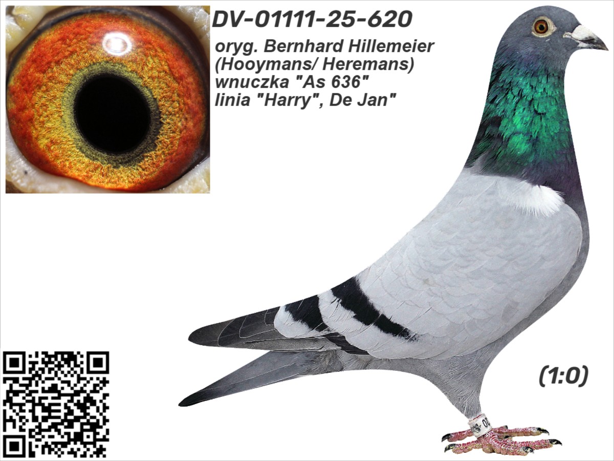 oryg. Bernhard Hillemeier (Hooymans/ Heremans), wnuczka "As 636", linia "Harry", De Jan" Szczegóły pochodzenia w rodowodzie. Gołąb jest sprzedawany bezpośrednio od hodowcy i znajduje się w Polsce, można go obejrzeć w miejscowości Zblewo (woj. pomorskie), po wcześniejszym kontakcie telefonicznym. Więcej informacji o gołębiu i transporcie pod nr tel.: 511 607 710.