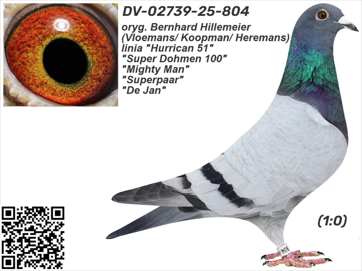 oryg. Bernhard Hillemeier (Vloemans/ Koopman/ Heremans), linia "Hurrican 51", "Super Dohmen 100", "Mighty Man", "Superpaar", "De Jan" Szczegóły pochodzenia w rodowodzie. Gołąb jest sprzedawany bezpośrednio od hodowcy i znajduje się w Polsce, można go obejrzeć w miejscowości Zblewo (woj. pomorskie), po wcześniejszym kontakcie telefonicznym. Więcej informacji o gołębiu i transporcie pod nr tel.: 511 607 710.