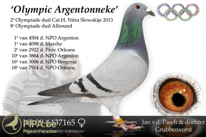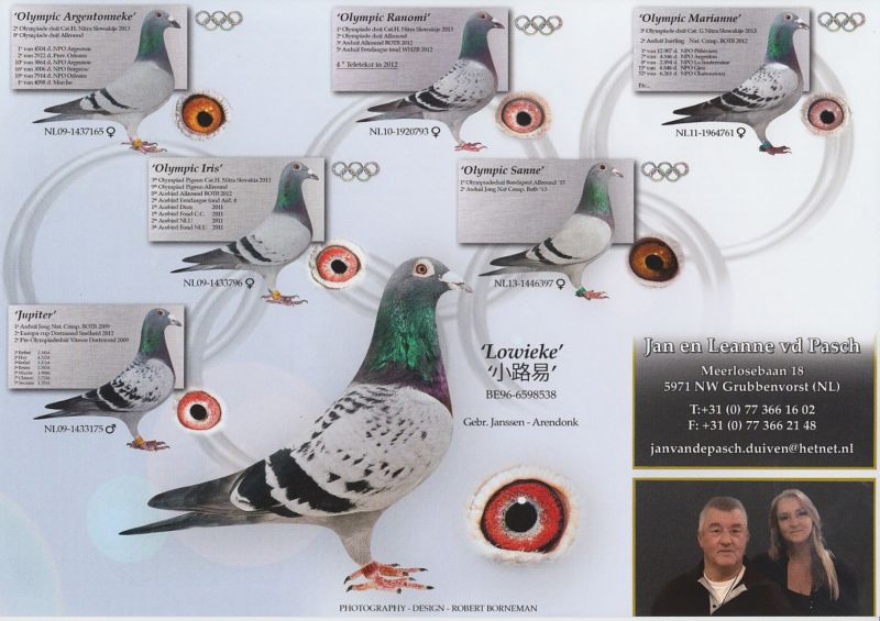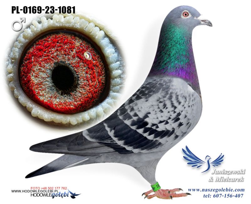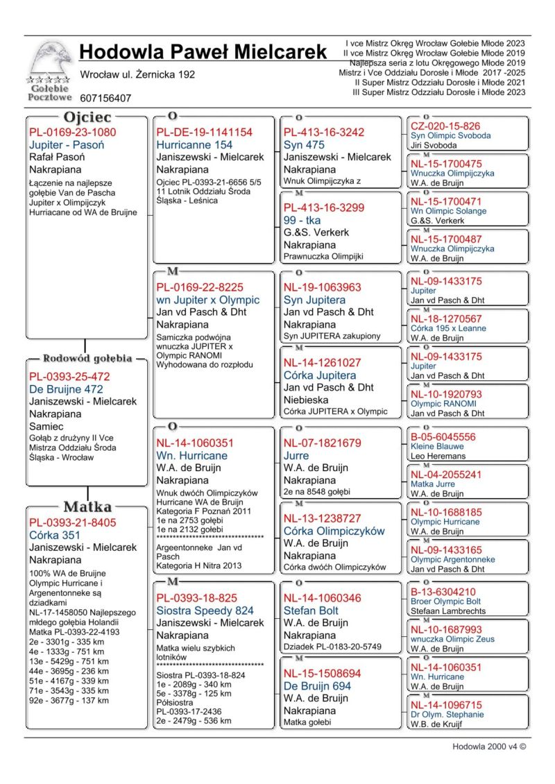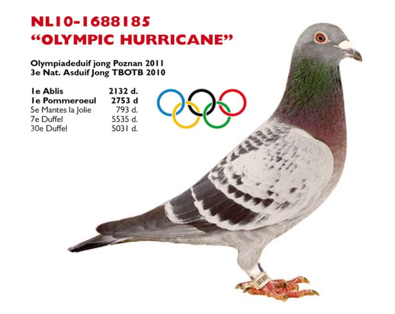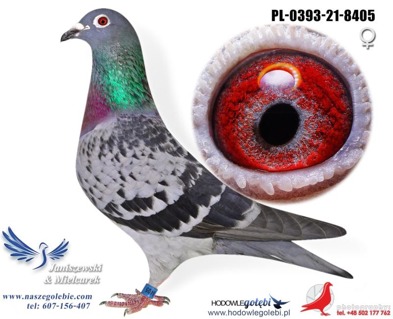 Gołąb z hodowli zmarłego hodowcy Zenona Janiszewskiego Ładny samczyk wywodzącego się ze słynnego Jupitera od van de Pascha + wspaniałe gołębie od WA de Bruijna z rodziny Olimpic Hurricane. W tym gołębiu jest wiele mistrzowskiej krwi. Matka 8405 wielu świetnych lotników między innymi 4193