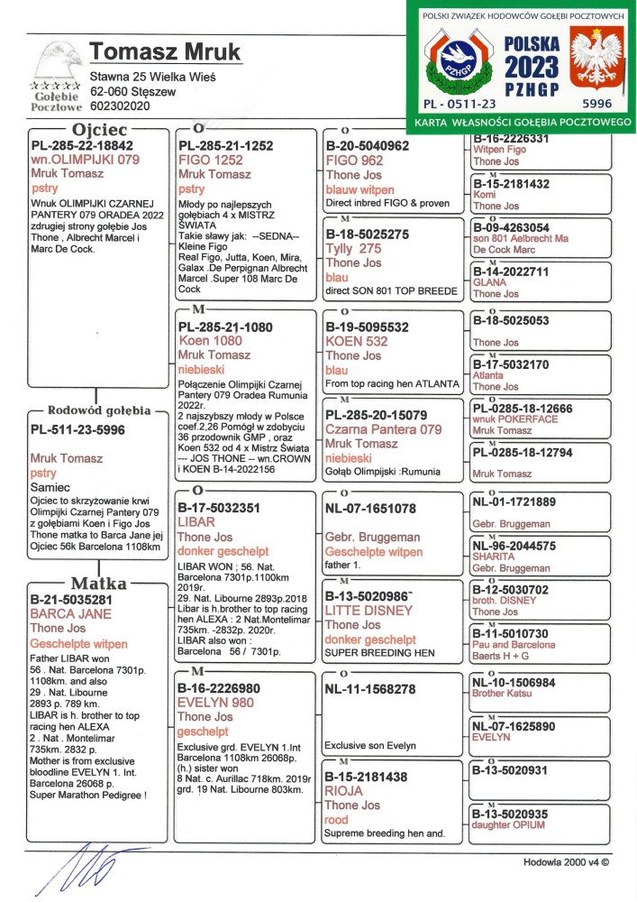 Oryginalny gołab z hodowli Tomasza Mruka. Szczegóły pochodzenia w rodowodzie. Więcej informacji pod nr tel.: 507805142. Koszt wysyłki po stronie kupującego.