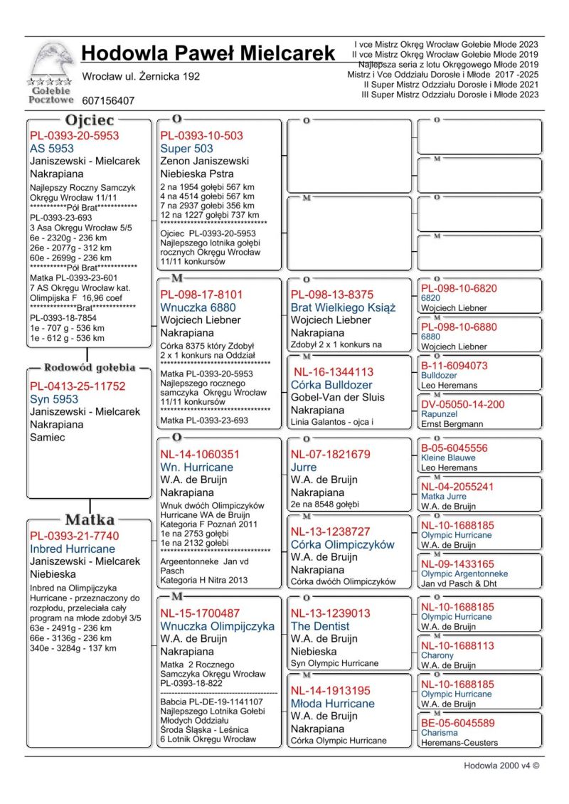 Gołąb z hodowli zmarłego hodowcy Zenona Janiszewskiego. Samczyk to syn Najlepszego Lotnika Okręgu Wrocław - Samczyki roczne, jest wnukiem najlepszej samicy rozpłodowej 8101 od kolegi Wojtka Liebnera. Matka 7740 to inbred Olympic Hurricane od słynnego WA de Bruijne. Gołąb szczepiony na paramixowirozę, ospę i salmonellozę! Odbiór gołębi: Najchętniej osobiście (Wrocław) Możliwa wysyłka prywatnym kurierem koszt pokrywa kupujący około 150 zł Szczegóły proponowanych gołębi znajdziecie w rodowodzie oraz pod numerem 607156407 o telefony proszę po godzinie 16ej.