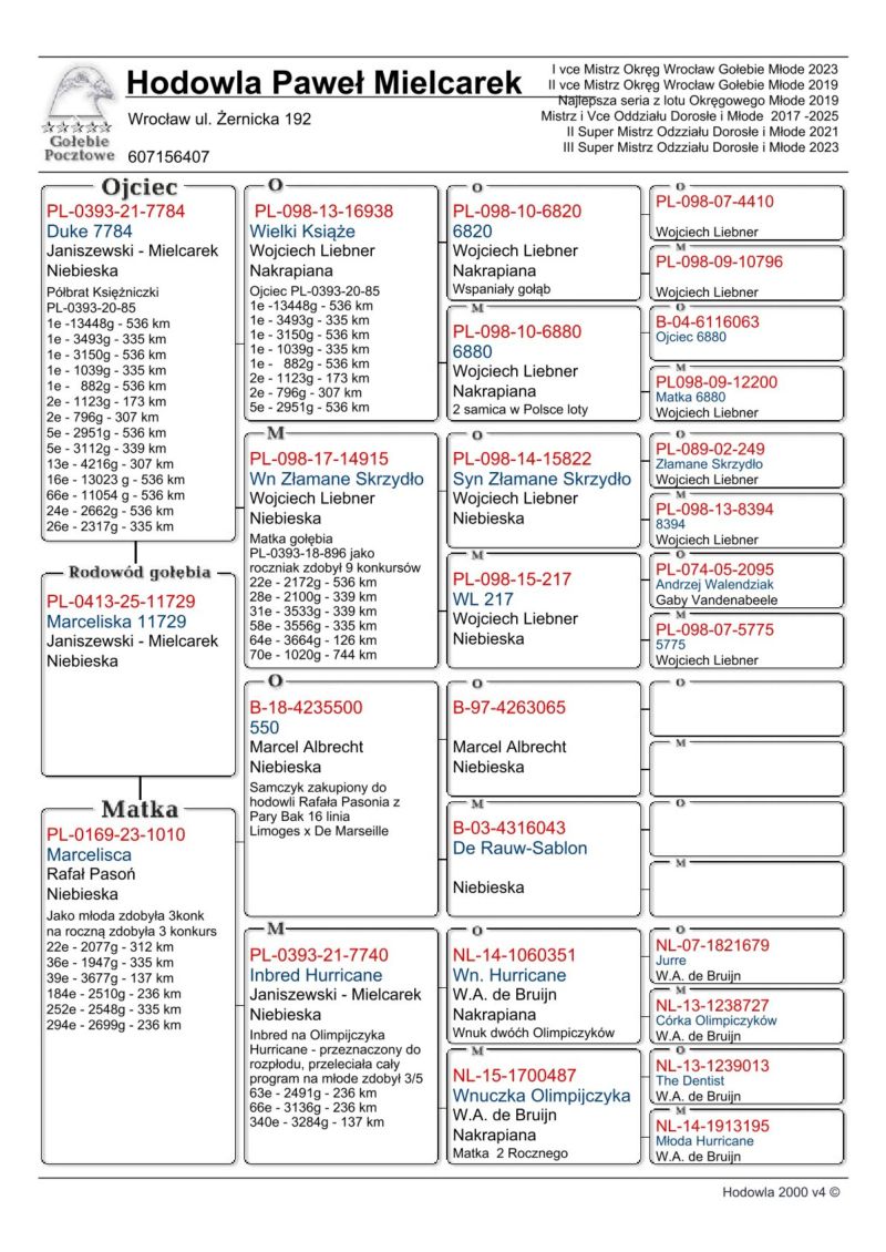 Gołąb z hodowli zmarłego hodowcy Zenona Janiszewskiego. Ojciec Samczyka to pół brat Księżniczki - wspaniałej lotniczki, wywodzi się z najlepszych gołębi kolegi Wojtka Liebnera. matka to łączenie gołębi Macelisa Albrechta i WA de Bruijne. Gołąb szczepiony na paramixowirozę, ospę i salmonellozę! Odbiór gołębi: Najchętniej osobiście (Wrocław) Możliwa wysyłka prywatnym kurierem koszt pokrywa kupujący około 150 zł Szczegóły proponowanych gołębi znajdziecie w rodowodzie oraz pod numerem 607156407 o telefony proszę po godzinie 16ej.