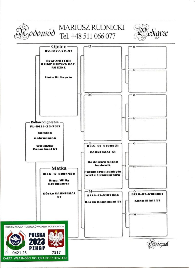 Wnuk Kannibaal 51, najlepszego gołębia w hodowli Willy Steenaerts. Ojciec DV-0127-22-97 jest pełnym bratem Złotego Olimpijczyka z 2022 roku z Linii DI CAPRIO. Szczegóły pochodzenia w rodowodzie i pod nr tel. 696 241 555