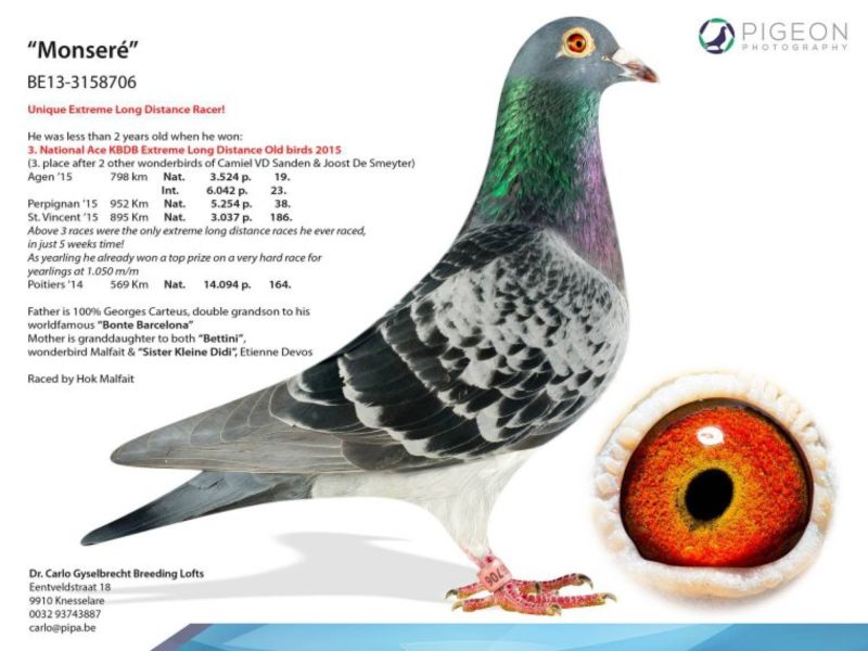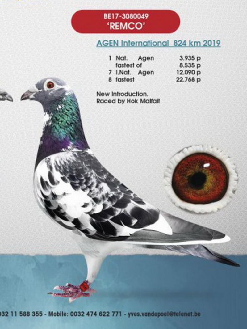 Ojciec to brat Remco. REMCO wygrał jeden z najcięższych lotów narodowych ostatnich lat w Belgii w temperaturze ponad 30 stopni i z jednodniowym opóźnieniem ze startem ze względu na mgłę. Odbił się o świcie następnego dnia o godz. 04:24 i był pierwszym gołębiem Belgii na 8535 gołębi z lotu Agen. REMCO to podwójny wnuk MONSERE, który był 3 lotnikiem Belgii na ekstremalnym dystansie. W rodowodzie linia NEW LAUREAAT. Matka to siostra złotego medalisty na olimpiadzie. Szczegóły pochodzenia w rodowodzie i pod nr tel. 696 241 555