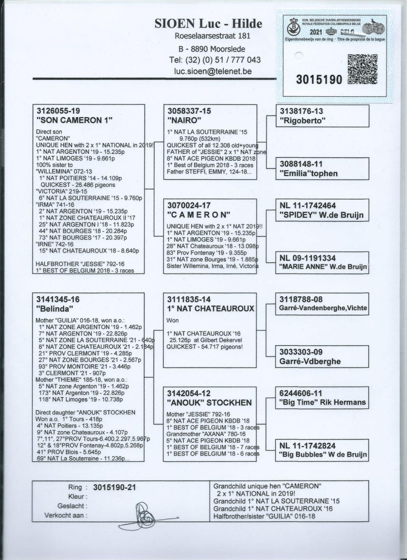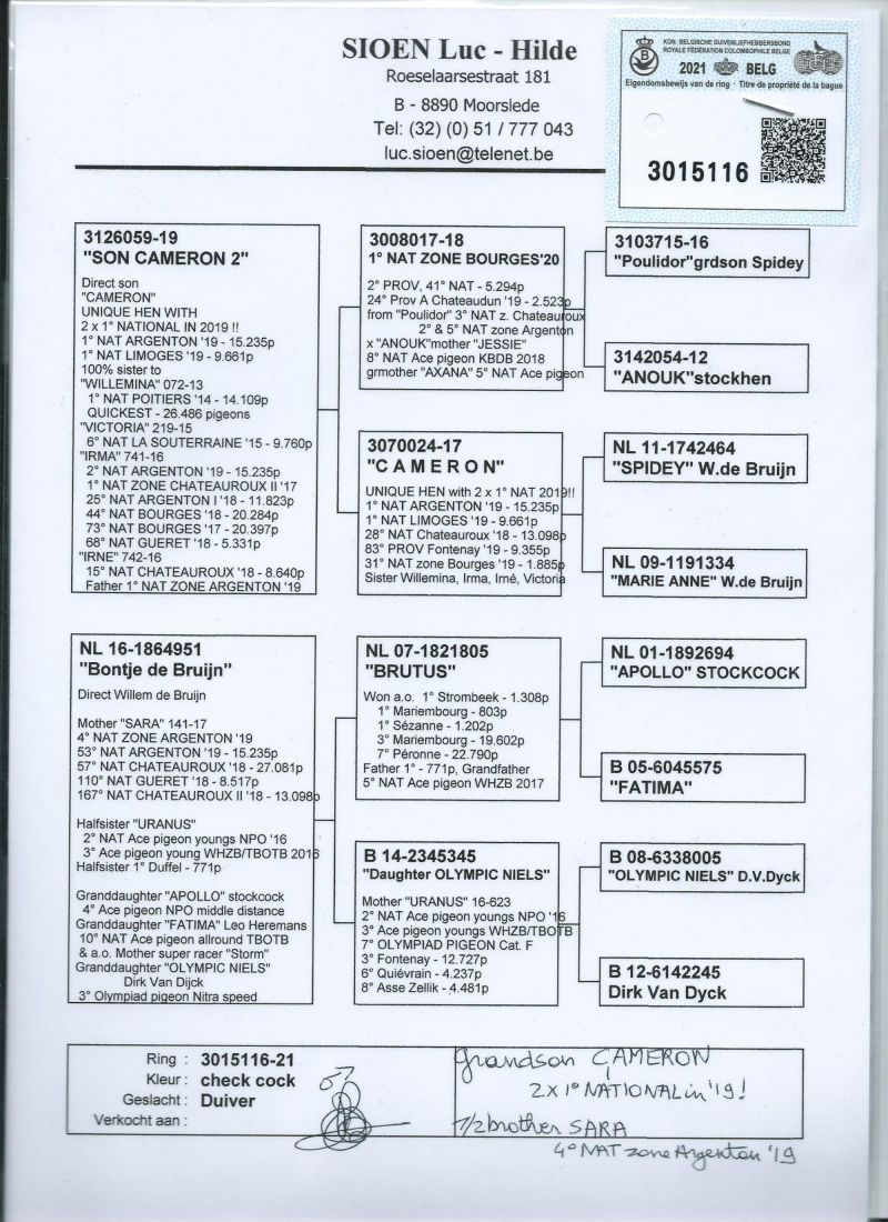 Fajna samiczka - Inbred na "Cameron" (wnuczka "Jeroen" - najlepszy samiec W.de Bruijn) - 2 X 1 Narodowy na ponad 9 i 15 tyś g. w 2019 roku - sprzedana w tym samym roku do Chin za 800 000 Euro !! Hodowla Hilda & Luc Sioen hodowlę swoją opartą mają w większości na gołębiach Willem de Bruijn z Jego najlepszych linii .od 2017 roku 30x mistrzostwo oddz w różnych kategoriach w tym 2019-2021 3 x z rzędu supermistrzostwo oddziału Poznań, więcej info 601 877 544 youtube.com/watch?v=PnrNZw6FUk4 youtube.com/watch?v=n8IiJ8wn6-E youtube.com/watch?v=b2Rnw7tSU6U youtube.com/watch? v=b2Rnw7tSU6U&t=1s