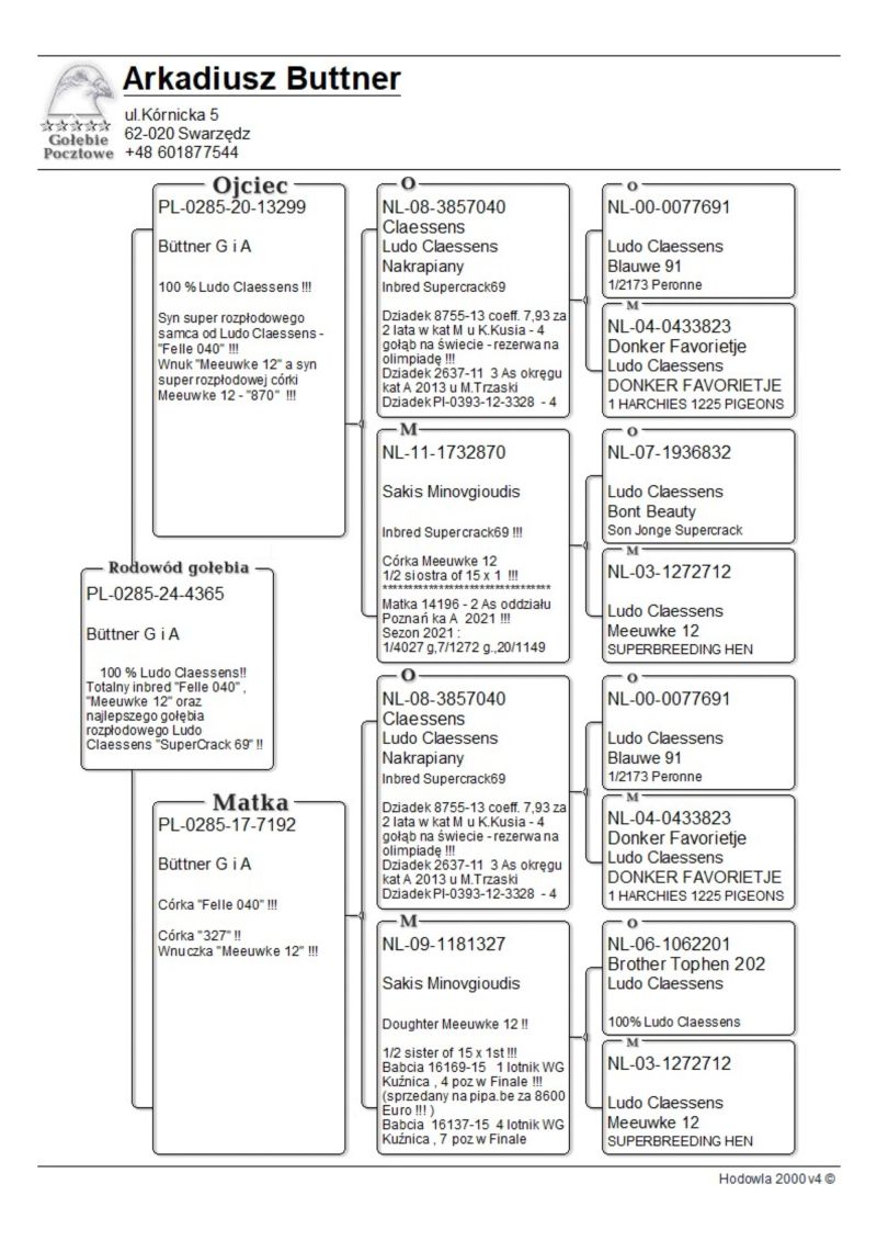 PL-0285-24-4365 Büttner G i A 100% LUDO CLAESSENS - INBRED: FELLE 040, MEEUWKE 12, SUPERCRACK 69 !!