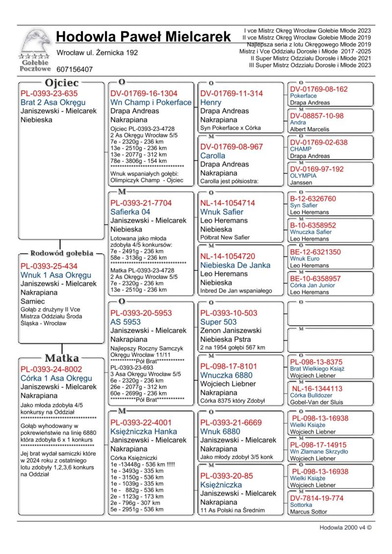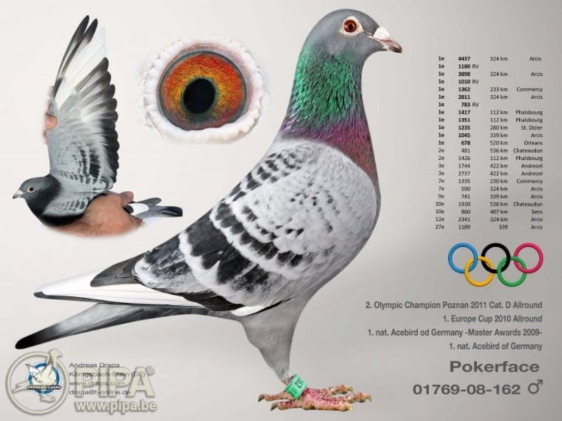 Gołąb z hodowli zmarłego hodowcy Zenona Janiszewskiego. Ojciec to brat 2 Lotnika Okręgu Wrocław wywodzący się z gołębi Andreasa Drapy linia Pokerface oraz Leo Heremans Linia Safier oraz De Jan, Matka to córka 1 Asa Okręgu Wrocław gołębi rocznych i Wnuczka Księżniczki 3 Asa Okręgu Wrocław B kategoria oraz 11 lotnika Polski na średnim dystanie która wygrała lot w którym uczestniczyło 13448 gołębi. Gołąb szczepiony na paramixowirozę, ospę i salmonellozę! Odbiór gołębi: Najchętniej osobiście (Wrocław) Możliwa wysyłka prywatnym kurierem koszt pokrywa kupujący około 150 zł Szczegóły proponowanych gołębi znajdziecie w rodowodzie oraz pod numerem 607156407 o telefony proszę po godzinie 16ej.