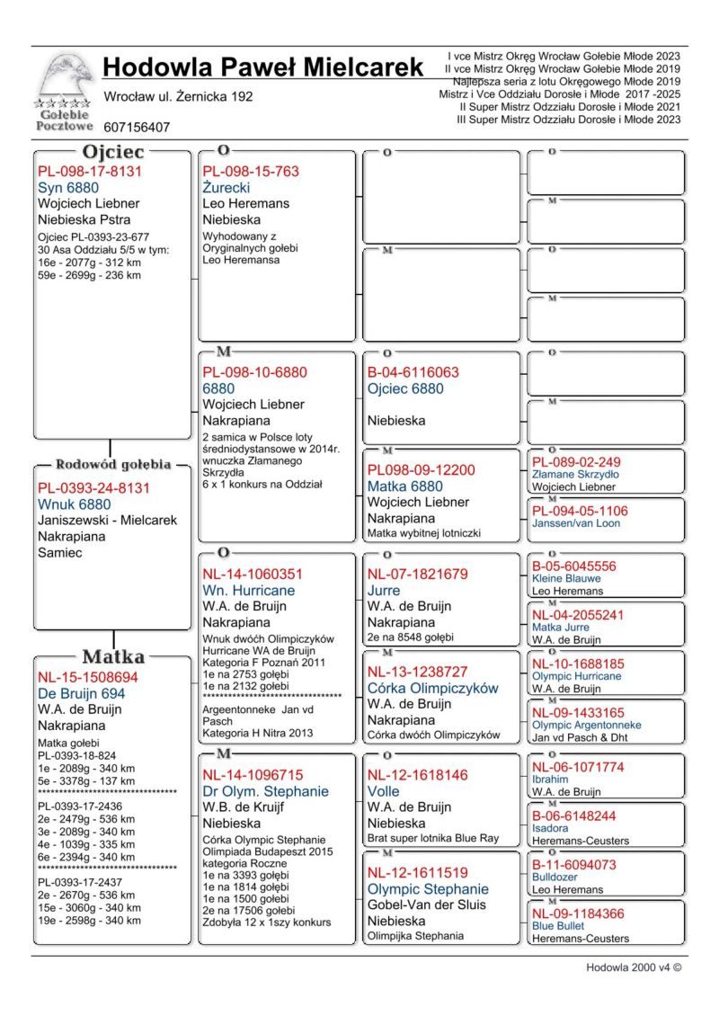 Gołąb z hodowli zmarłego hodowcy Zenona Janiszewskiego. Ojciec to syn 6880 - 2 Lotniczki Polski na średnim dystansie która w całej swojej karierze zdobyła 6 x 1 konkurs. Matka to samiczka z rodziny gołębi WA de Bruijne która dała wiele dobrych lotników a wywodzi się z super gołębi Olympic Hurricane, Olympic Argentonneke, Olympic Stephanie czy Kleine Blauwe. Gołąb szczepiony na paramixowirozę, ospę i salmonellozę! Odbiór gołębi: Najchętniej osobiście (Wrocław) Możliwa wysyłka prywatnym kurierem koszt pokrywa kupujący około 150 zł Szczegóły proponowanych gołębi znajdziecie w rodowodzie oraz pod numerem 607156407 o telefony proszę po godzinie 16ej.