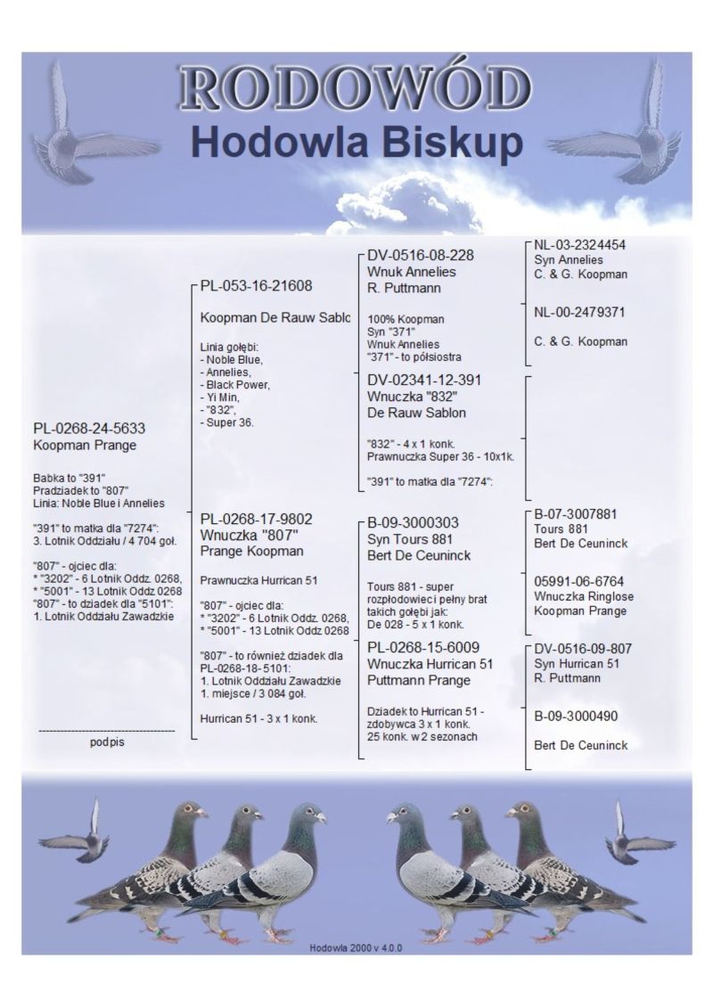 Babka to "391"; Pradziadek to "807"; Linia: Noble Blue i Annelies; "391" to matka dla "7274": 3.Lotnik Oddziału / 4 704 goł.; "807" - ojciec dla: * "3202" - 6 Lotnik Oddz. 0268, * "5001" - 13 Lotnik Oddz 0268; "807" - to dziadek dla "5101": 1.Lotnik Oddziału Zawadzkie; /// Koszt wysyłki 150 zł ///