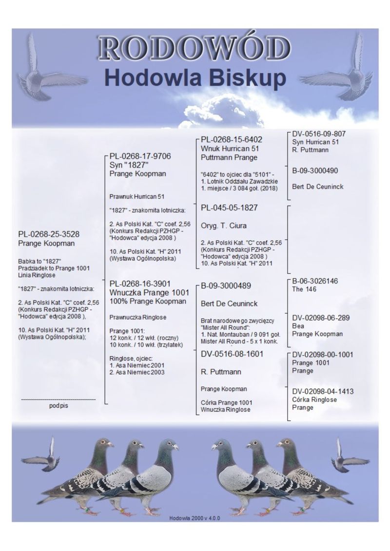 Babka to "1827"; Pradziadek to Prange 1001; Linia Ringlose; "1827" - znakomita lotniczka: 2. As Polski Kat. "C" coef. 2,56 (Konkurs Redakcji PZHGP - "Hodowca" edycja 2008 ), 10. As Polski Kat. "H" 2011 (Wystawa Ogólnopolska); /// Koszt wysyłki 150 zł ///