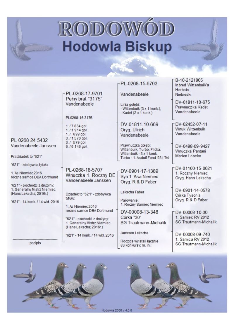 Pradziadek to "621"; "621" - zdobywca tytułu: 1. As Niemiec 2016 roczne samce DBA Dortmund, "621" - pochodzi z drużyny: 1. Generalny Mistrz Niemiec (Hans Lekscha; 2016r.), "621" - 14 konk. / 14 wkł. 2016 /// Koszt wysyłki 150 zł ///