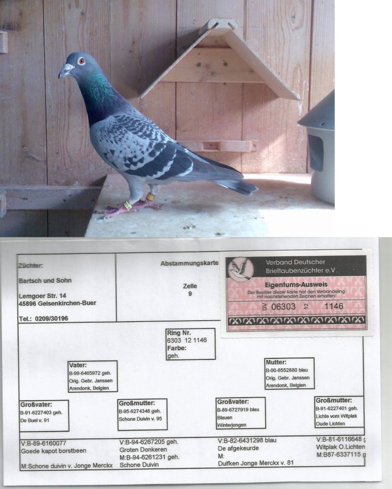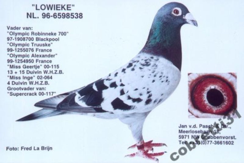 Bazowe gołębie u Jos De Klak, Koopman, Eijerkamp itd. Prawnuk do Blauwe Winterjungen. Lowieke jest ojcem trzech olimpijczyków, a jednocześnie wnukiem Winterjungen. Samica "Janssen 062" jest córką Winterjungen wydała dzieci 8x1 Theo Lehnen. Gołąb zaszczepiony przeciwko paramiksowirozie i salmonelle. Więcej informacji udzielę telefonicznie.