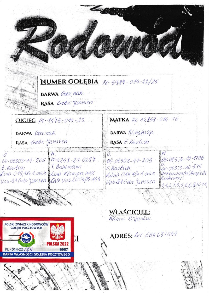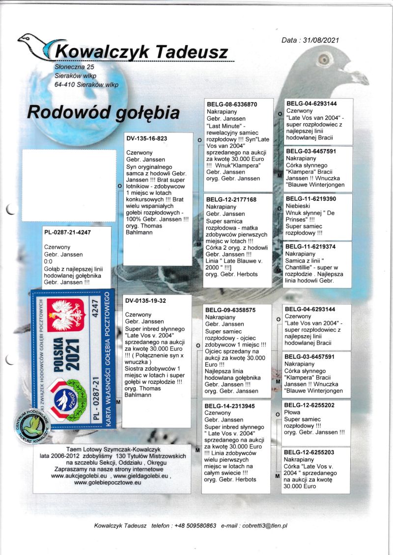 Bazowe gołębie u Jos De Klak, Koopman, Eijerkamp itd. Linia 019 18x1 , Vos 81, Klamper. DV 1706 jest córką rezerwowego gołębia na Olimpiadę 1,1,2,3,3,5,6,6,8,10,11. zaszczepiony przeciwko paramiksowirozie i salmonelle. Więcej informacji udzielę telefonicznie.