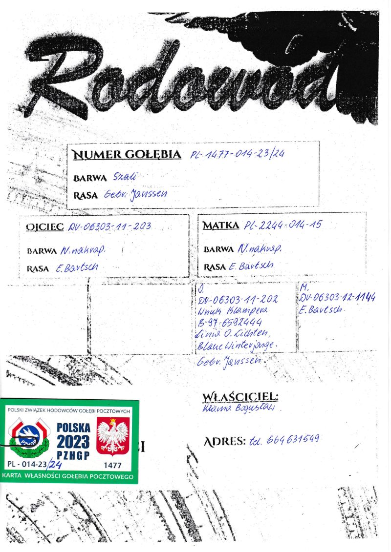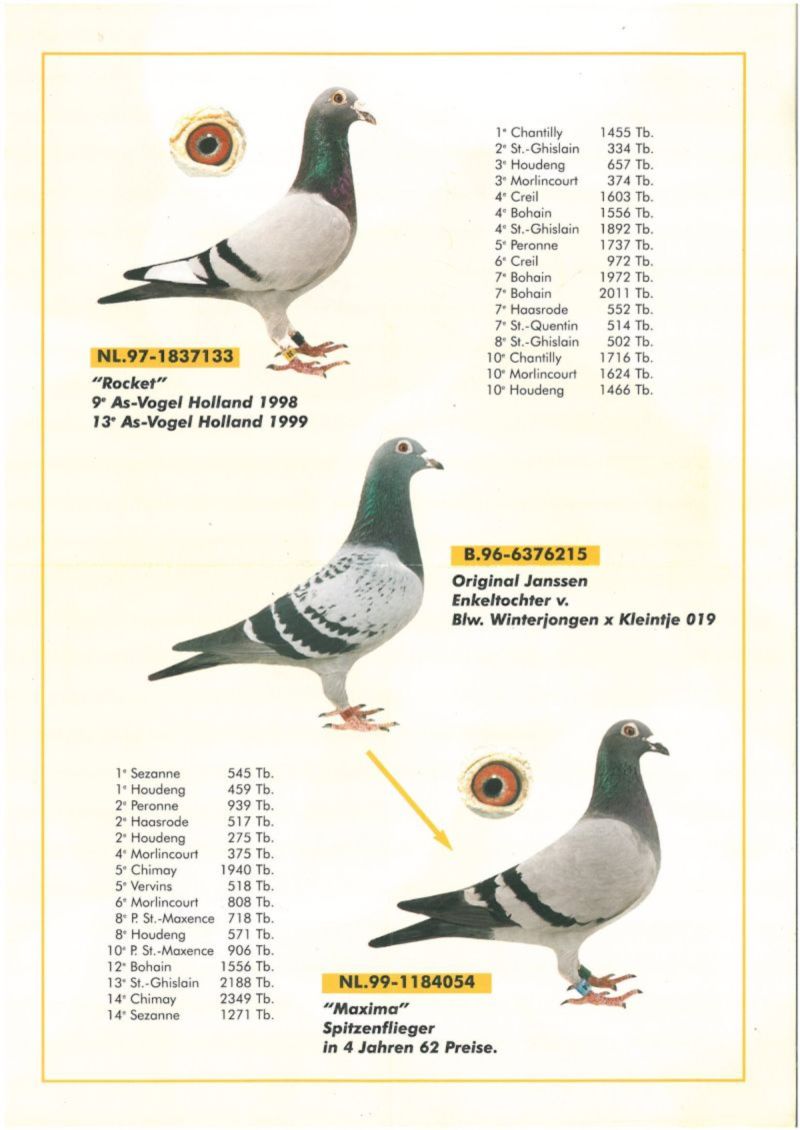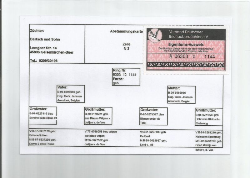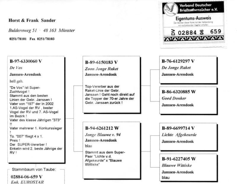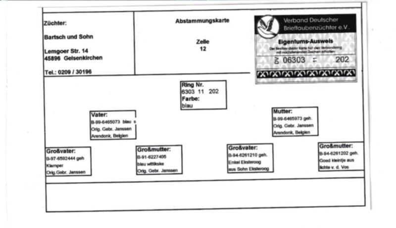 Bazowe gołębie u Jos De Klak, Koopman, Eijerkamp itd. Linia 019 18x1 , Vos 81, Klamper. DV 1706 jest córką rezerwowego gołębia na Olimpiadę 1,1,2,3,3,5,6,6,8,10,11. zaszczepiony przeciwko paramiksowirozie i salmonelle. Więcej informacji udzielę telefonicznie.