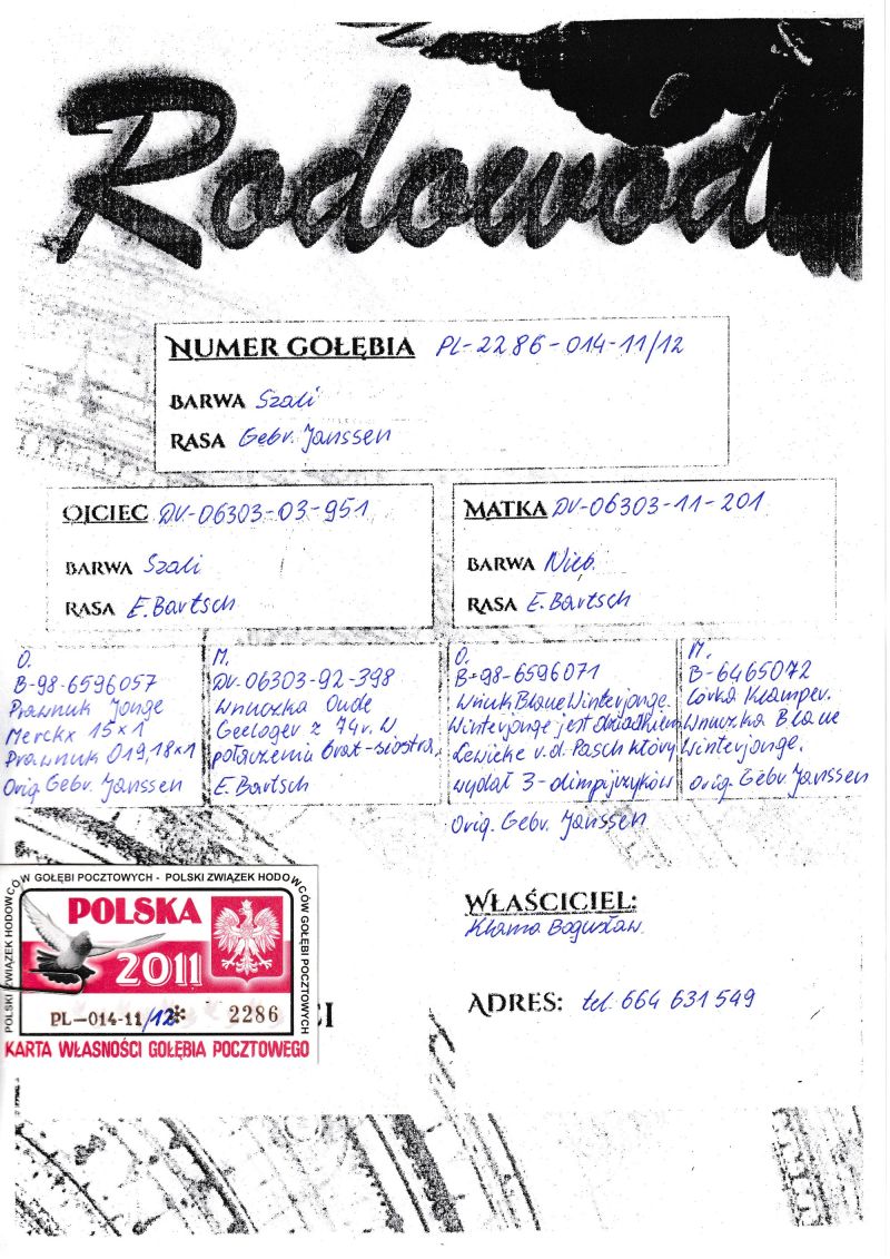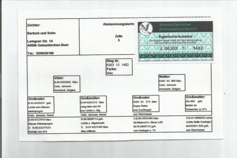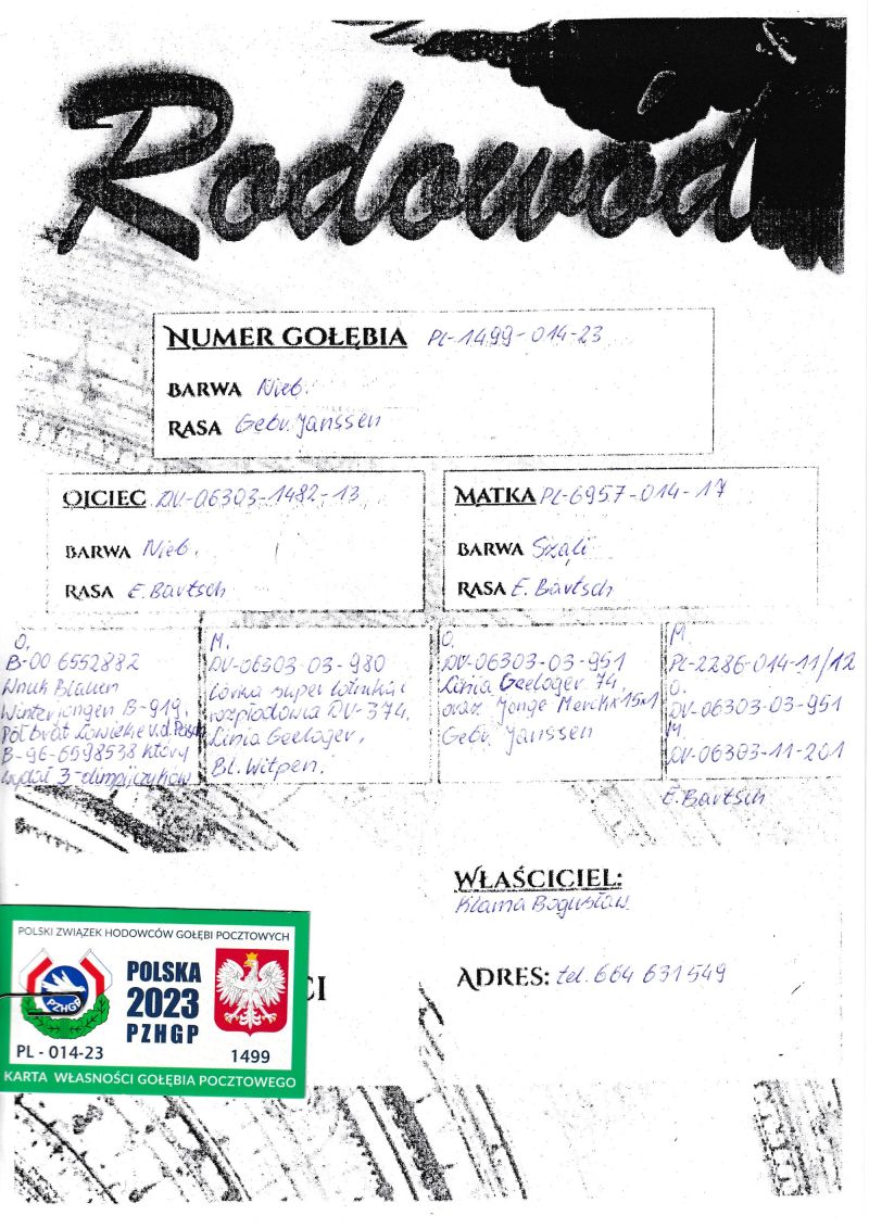 Bazowe gołębie u Jos De Klak, Koopman, Eijerkamp itd. Linia Geeloger 74, Jounge Merckx 15x1 , Winterjungen super samiec rozpłodowy. Lowieke jest ojcem trzech olimpijczyków, a jednocześnie wnukiem Winterjungen. Samica "Janssen 062" jest córką Winterjungen wydała dzieci 8x1 Theo Lehnen. Gołąb zaszczepiony przeciwko paramiksowirozie i salmonelle. Więcej informacji udzielę telefonicznie.