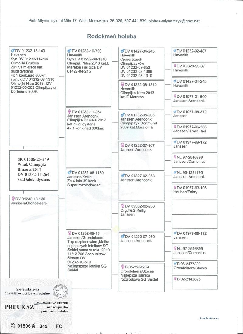 Havenith , gołąb dalekodystansowy. Wnuk (wnuczka)Olimpijki Bruksela 2017 kat.E daleki dystans DV 01232-11-264, m.in. zdobyła 4x 1 konk. na odległości nad 800 km.Rodzina Seidel posiada siedmiu Olimpijczyków w kategorii daleki dystans, m.in. DV 01232-15-306 Olimpijka z Oradea 2022, pierwszy gołąb niemiec i 17 świata. Gołąbki zaszczepione msv i odrobaczone. Transport gołębi kurierem po wcześniejszym uzgodnieniu,odbiór osobisty.