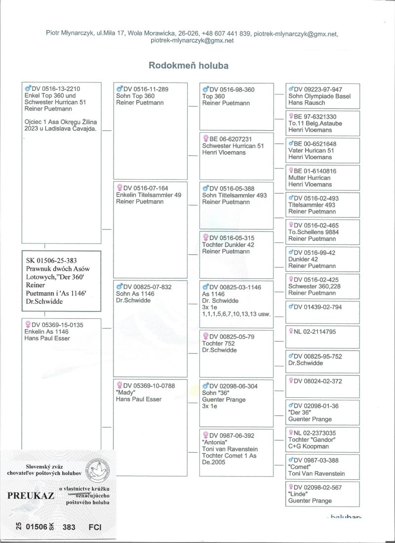 Prawnuk dwóch Asów lotowych "Der 360"Reiner Puetmann i"As 1146"Dr.Schwidde.Ojciec gołębia jest ojcem 1 Asa okregu Zilina 2023 u Ladislava Cavajda.Matka oryg.Hans Paul Esser wnuczka "1146"Asa lotowego Dr.Schwidde.Linia "Comet"i "Hurican 51". Gołąb zaszczepiony MSV i odrobaczony.Transport kurierem po uzgodnieniu,odbiór osobisty