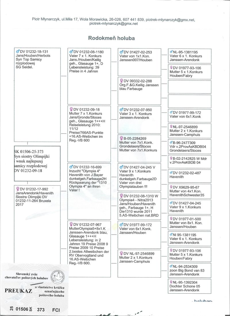 SK-01506-25-373 Havenith gołąb dalekodystansowy, wnuk wybitnej lotniczki i rozpłodowca DV 01232-09-18