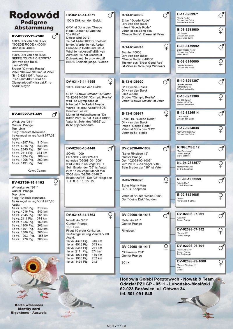 Oryginalny gołąb z hodowli Nowak & Team, szczegóły pochodzenia, rodowód poniżej. Transport gołębi prywatnym transportem.