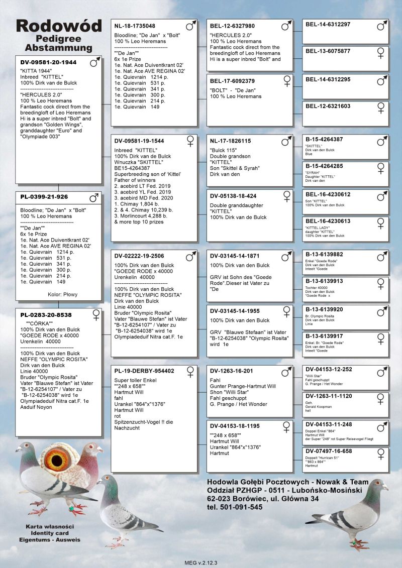 Oryginalny gołąb z hodowli Nowak & Team, szczegóły pochodzenia, rodowód poniżej. Transport gołębi prywatnym transportem.