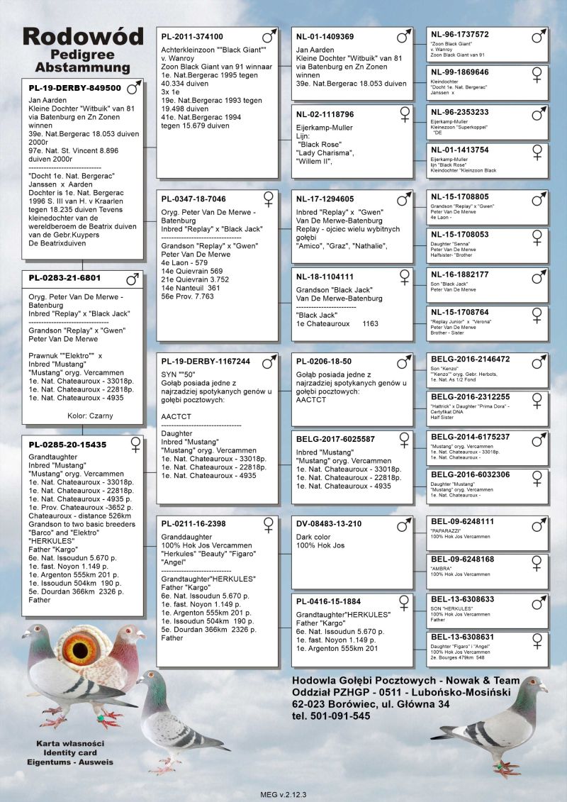 Oryginalny gołąb z hodowli Nowak & Team, szczegóły pochodzenia, rodowód poniżej. Transport gołębi prywatnym transportem.