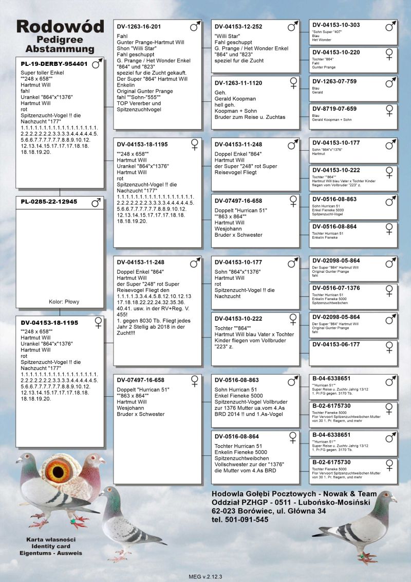 Oryginalny gołąb z hodowli Nowak & Team, szczegóły pochodzenia, rodowód poniżej. Transport gołębi prywatnym kurierem.