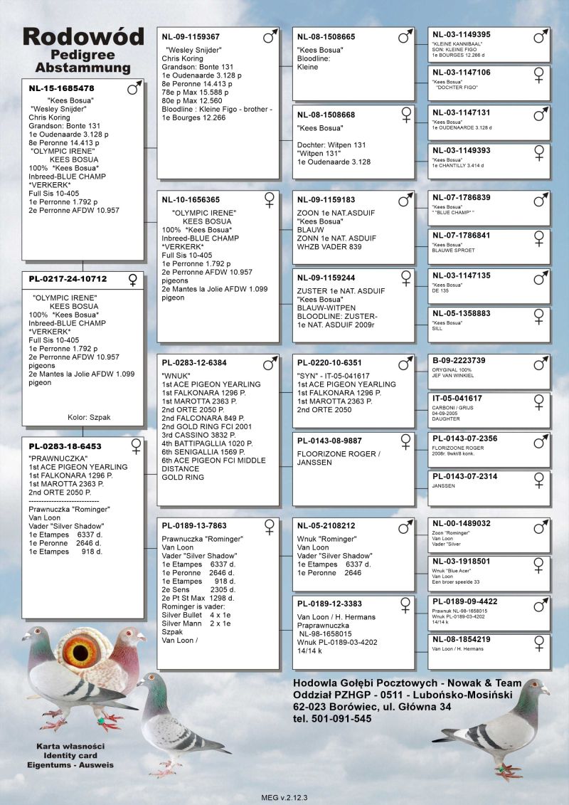 Oryginalny gołąb z hodowli Nowak & Team, szczegóły pochodzenia, rodowód poniżej. Transport gołębi prywatnym kurierem.