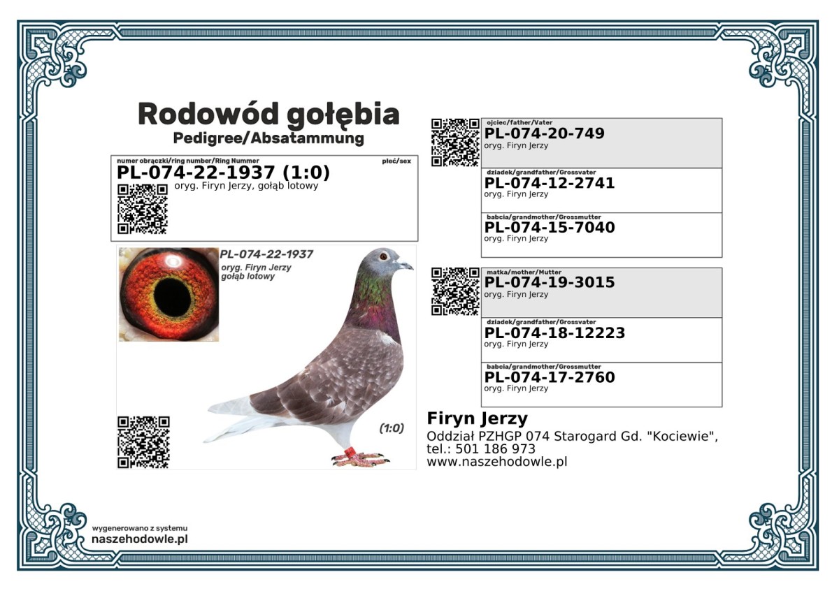 oryg. Firyn Jerzy, gołąb lotowy Oferowany gołąb pochodzi z hodowli zmarłego ś.p. Jerzego Firyna. Wszystkie oferowane gołębie z tej hodowli są gołębiami lotowymi. Hodowca lotował wiele lat w Oddziale 074 Starogard Gd. - Kociewie. Szczegóły pochodzenia w rodowodzie. Więcej informacji o gołębiach i transporcie pod nr tel.: 501 186 973.