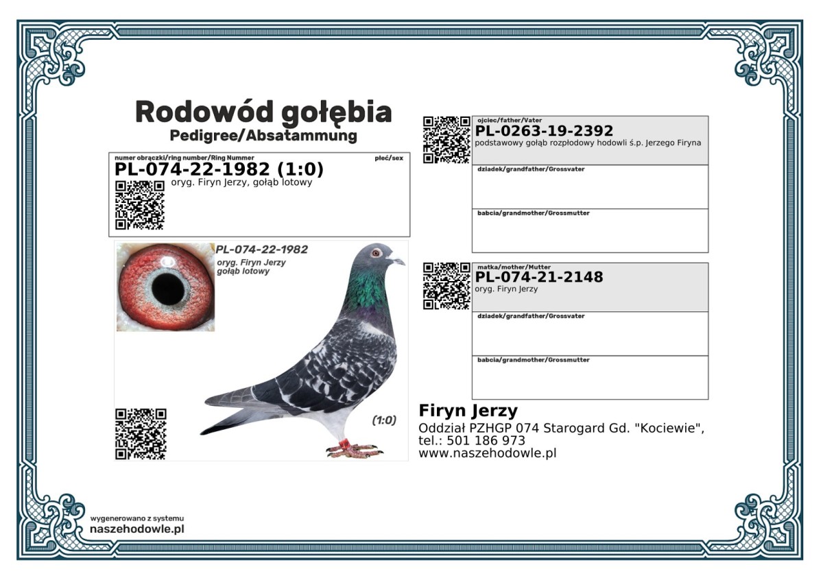 oryg. Firyn Jerzy, gołąb lotowy Oferowany gołąb pochodzi z hodowli zmarłego ś.p. Jerzego Firyna. Wszystkie oferowane gołębie z tej hodowli są gołębiami lotowymi. Hodowca lotował wiele lat w Oddziale 074 Starogard Gd. - Kociewie. Szczegóły pochodzenia w rodowodzie. Więcej informacji o gołębiach i transporcie pod nr tel.: 501 186 973.