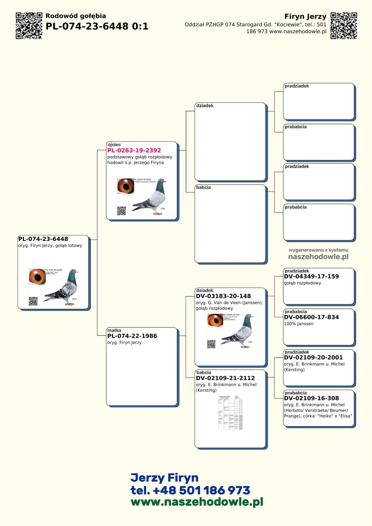 oryg. Firyn Jerzy, gołąb lotowy Oferowany gołąb pochodzi z hodowli zmarłego ś.p. Jerzego Firyna. Wszystkie oferowane gołębie z tej hodowli są gołębiami lotowymi. Hodowca lotował wiele lat w Oddziale 074 Starogard Gd. - Kociewie. Szczegóły pochodzenia w rodowodzie. Więcej informacji o gołębiach i transporcie pod nr tel.: 501 186 973.