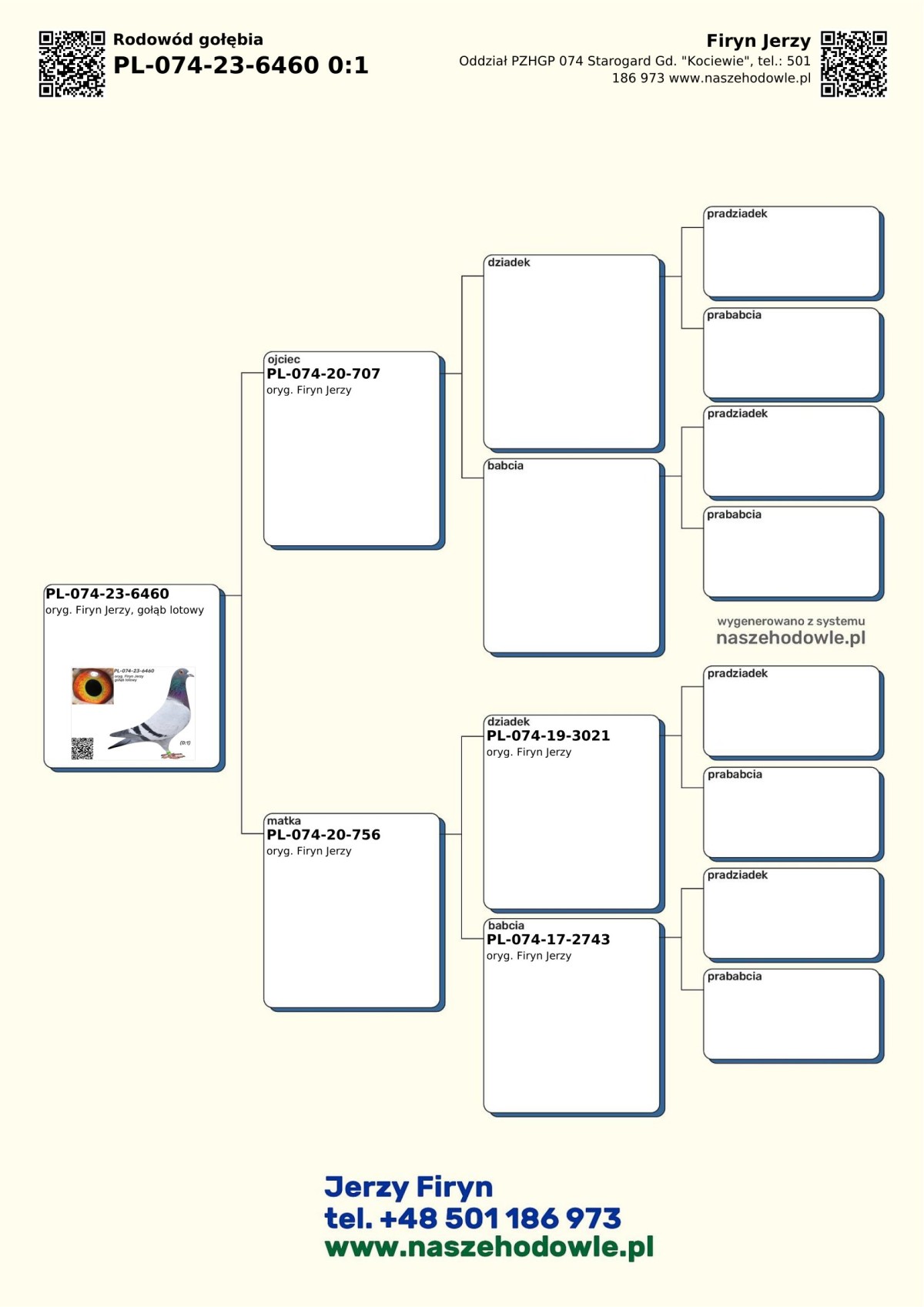 oryg. Firyn Jerzy, gołąb lotowy Oferowany gołąb pochodzi z hodowli zmarłego ś.p. Jerzego Firyna. Wszystkie oferowane gołębie z tej hodowli są gołębiami lotowymi. Hodowca lotował wiele lat w Oddziale 074 Starogard Gd. - Kociewie. Szczegóły pochodzenia w rodowodzie. Więcej informacji o gołębiach i transporcie pod nr tel.: 501 186 973.