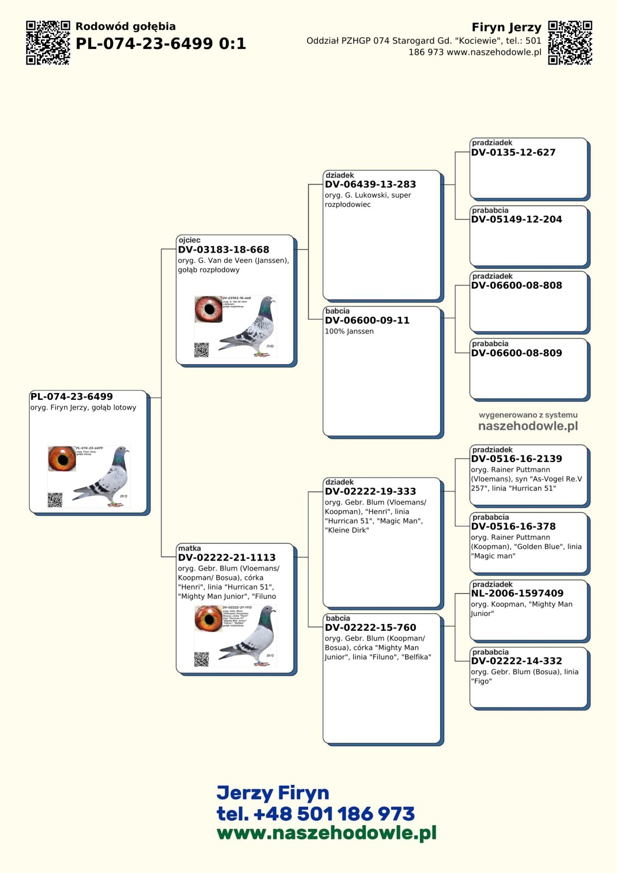 oryg. Firyn Jerzy, gołąb lotowy Oferowany gołąb pochodzi z hodowli zmarłego ś.p. Jerzego Firyna. Wszystkie oferowane gołębie z tej hodowli są gołębiami lotowymi. Hodowca lotował wiele lat w Oddziale 074 Starogard Gd. - Kociewie. Szczegóły pochodzenia w rodowodzie. Więcej informacji o gołębiach i transporcie pod nr tel.: 501 186 973.