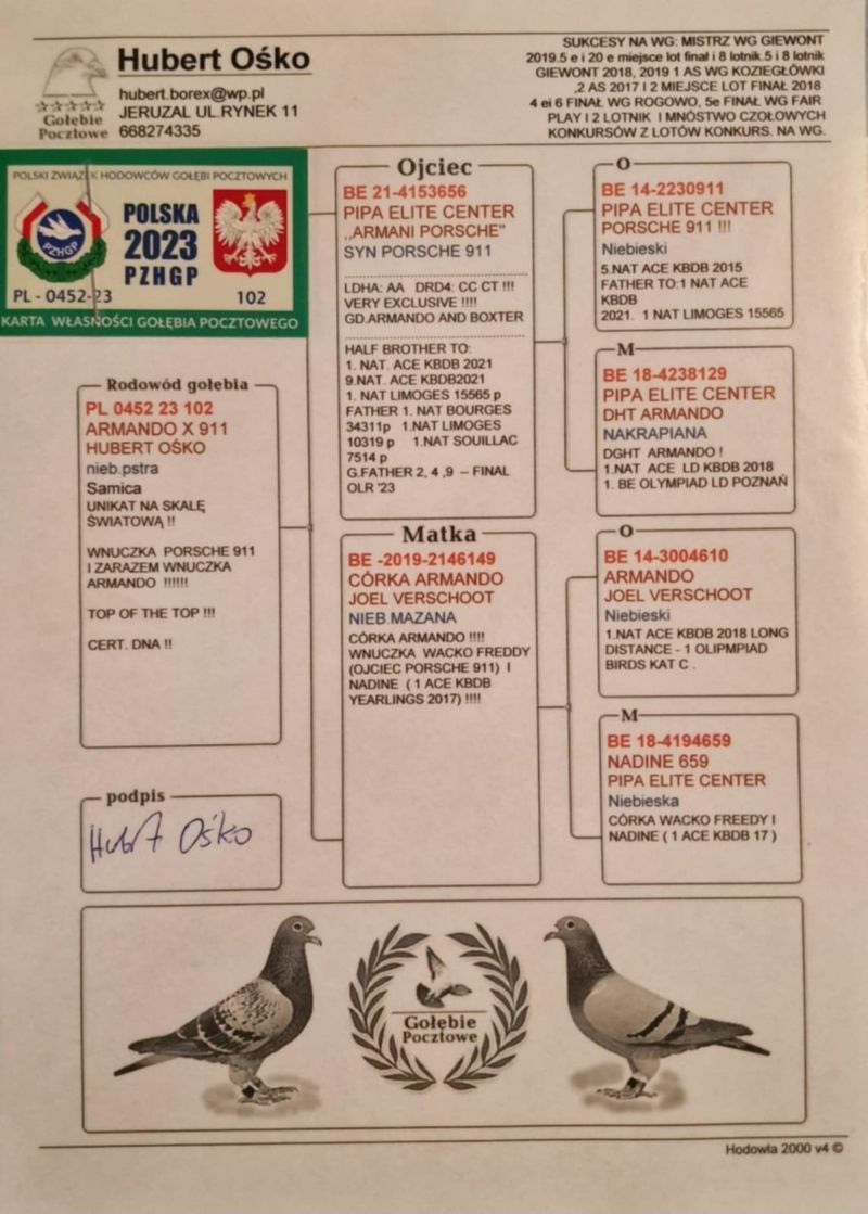 Przedmiotem aukcji jest bon na młodego gołębia. Rodowody rodziców 690x102 na zdjęciach.