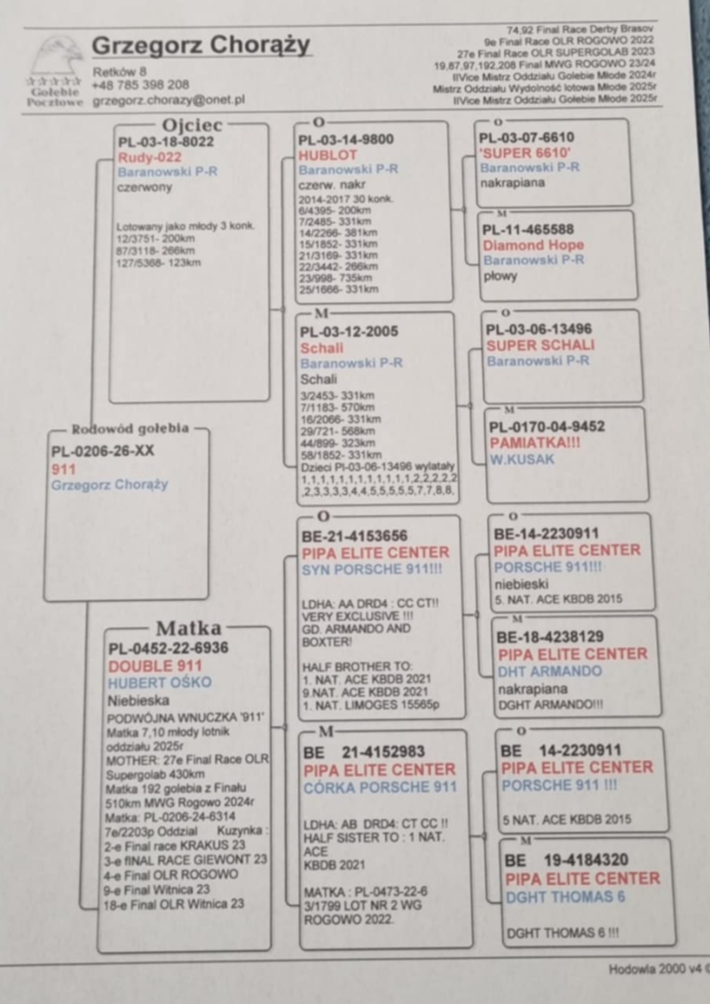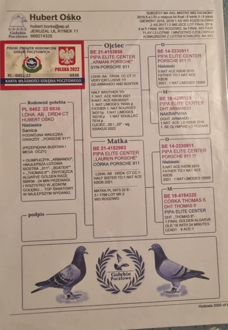 Przedmiotem aukcji jest bon na młodego gołębia. Rodowody rodziców 8022x6936 na zdjęciach.