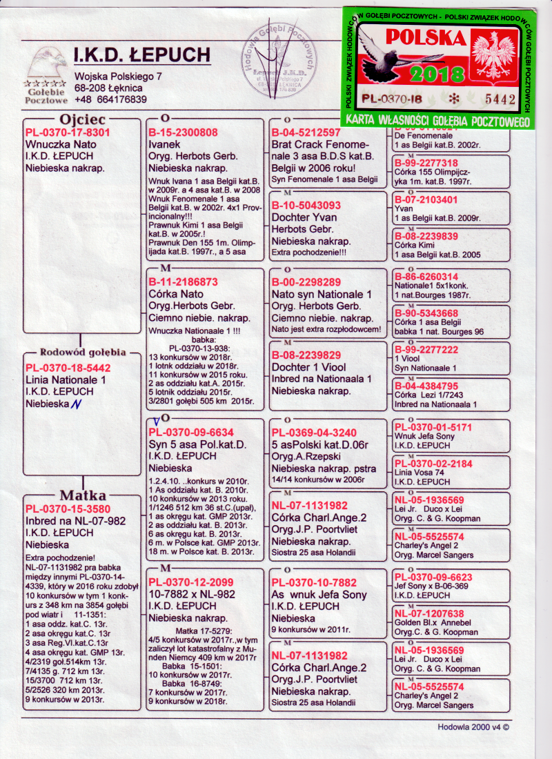 Witam, posiadam na sprzedaż ładną samicę z hodowli IKD Łepuch. Szczegóły pochodzenia w rodowodzie. Transport prywatnym kurierem lub możliwy odbiór na trasie A2 Warszawa - Poznań, A4 Rzeszów, Tarnów, Kraków, Katowice, Gliwice, Wrocław. Również Radom, Tomaszów Maz.,Kielce Jędrzejów. Więcej inf. dotyczących gołębia lub transportu pod nr.tel 693-122-004