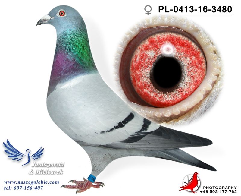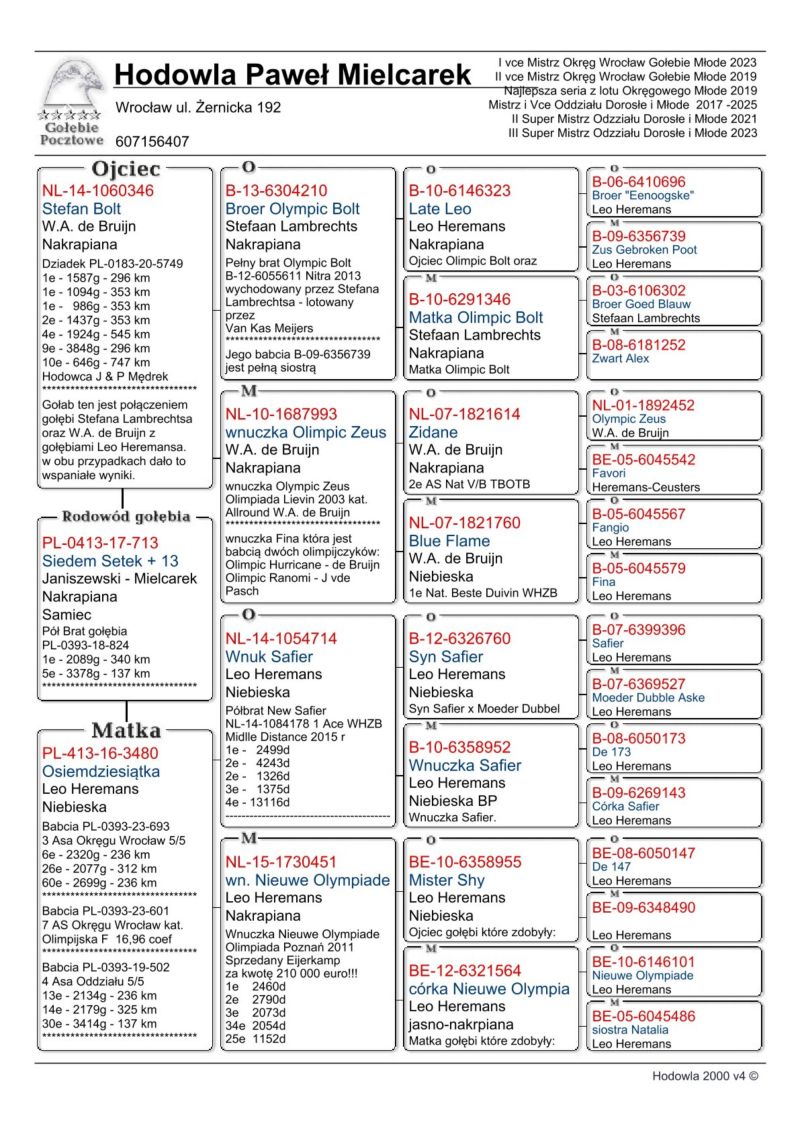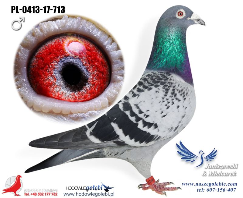 Gołąb z hodowli zmarłego hodowcy Zenona Janiszewskiego. Piękny Samiec, wywodzi się z najlepszych gołębi Leo Heremansa (Safier, Nieuwe Olympiade,) oraz gołebi WA de Bruijne - (Olympic Zeus, Zidane, Fina czy Blue Flame). Jego 100% brat PL-0413-17-603 dał super lotniczkę PL-0183-20-5749, Która zdobyła 3 x 1 konkurs na Oddział hodowca Mędrek J & P, Jego pół PL-0393-18-7907 zdobyła 2 x 1 Konkurs na Oddział w wygrała lot Okręgowy była 3 lotniczką Oddziału gołebi młodych hodowca Frydrych, kolejny pół brat PL-0393-18-824 zdobył 1 konkurs na Oddział hodowca Janiszewski- Mielcarek. Jego Pół brat (od strony matki) wygrał lot gołebi młodych o Mistrzostwo Ziemi Cieszyńskiej hodowca Jan Buczek