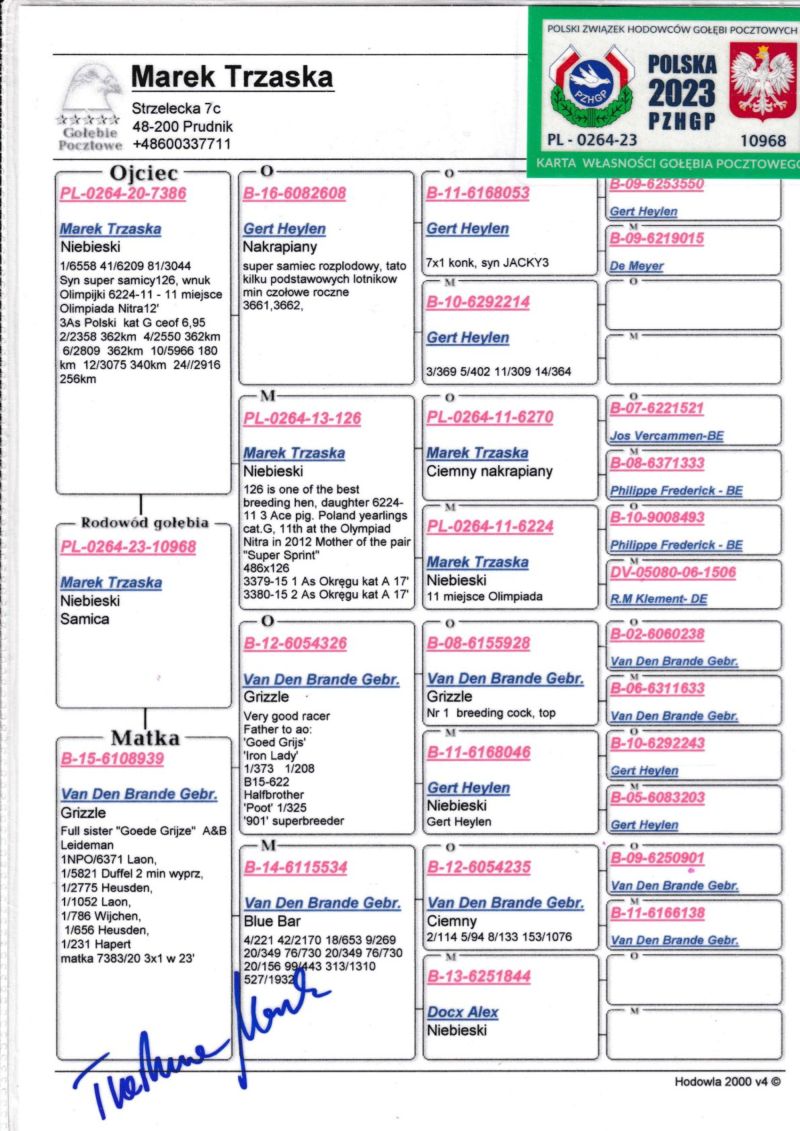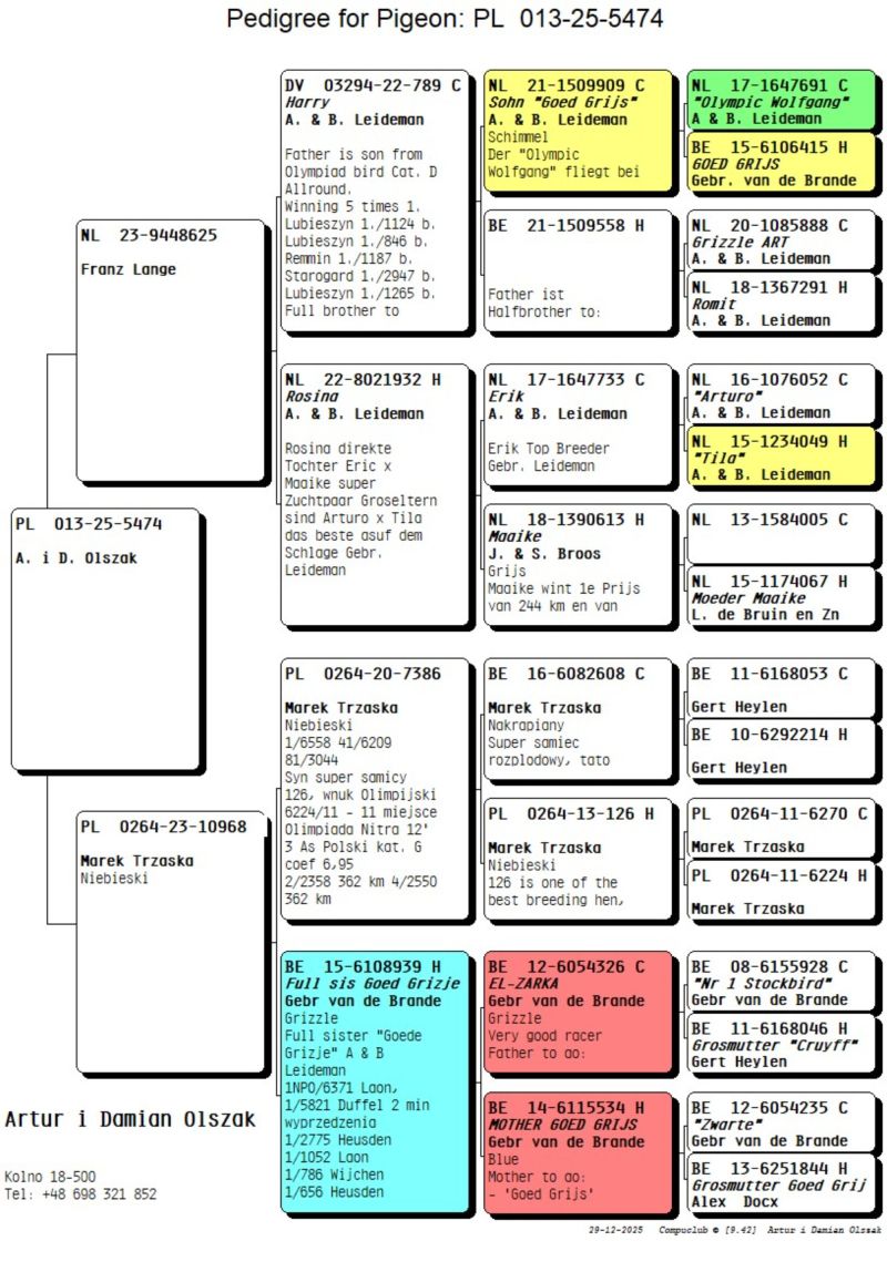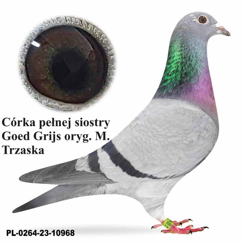 Najprawdopodobniej samiec. Matka młodego jest córką siostry Goed Grijs i półsiostrą Olimpijki 2 gołąb Polski Kat. A (2022-2023). Materiał najwyższej klasy światowej. Kojarzenie w obrębie rodziny - nie krzyzówka. Bardzo dobry materiał do dalszej hodowli. Gołąb zaszczepiony przeciwko paramiksowirozie i przygotowany do lęgów. Transport 1-5 sztuk 150 zł. Więcej informacji udzielę telefonicznie.