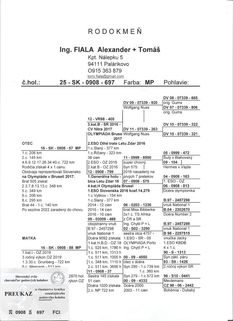 Oryginalny gołąb z hodowli długorocznych mistrzów Słowacji we wszystkich kategoriach.Możliwość sprawdzenia wyników na poniżej podanym linku. Výsledký 2025 1.miesto Majstri OZ Šurany staré a mladé holuby 1.miesto Majstri Nitrianskeho regiónu - Nitra, Bratislava, Komárno, Šurany. 1.miesto MAJSTROVSTVO SLOVENSKA KRÁTKE a STREDNÉ TRATE 2. miesto INTERMAJSTRVO SLOVENSKA 9.miesto MAJSTROVSTVO SLOVENSKA ROČNÉ HOLUBY 18.miesto MAJSTROVSTVO SLOVENSKA DLHÉ A SUPER DLHÉ TRATE Výsledky 2024 1.miesto Majstri OZ Šurany staré a mladé holuby 1.miesto Majstri Nitrianskeho regiónu - Nitra, Bratislava, Komárno, Šurany. 2. miesto INTERMAJSTRVO SLOVENSKA 2.miesto Retro majstrovstvo SLOVENSKA 3.miesto MAJSTROVSTVO SLOVENSKA KRÁTKE a STREDNÉ TRATE 3.miesto MAJSTROVSTVO SLOVENSKA DLHÉ A SUPER DLHÉ TRATE kat.D SR - 1, 3 miesto kat.I SR - 2. miesto kat.C SR - 4 miesto kat.B SR - 5 miesto 1. World Best Pigeon Dlhé trate SR 1. World Best Pigeon All Round SR Výsledky 2023 1. miesto Majstri OZ Šurany - staré holuby 2. miesto OZ Šurany - mladé holuby 4. miesto MAJSTROVSTVO SLOVENSKA STREDNÉ TRATE 4. miesto INTERMAJSTROVSTVO SR 6. miesto MAJSTROVSTVO SLOVENSKA DLHÉ A SUPER DLHÉ TRATE Výsledky 2022 2. miesto MAJSTROVSTVO SLOVENSKA STREDNÉ TRATE 9. miesto INETMAJSTROVSTVO SR 12. miesto MS ROČNÉ HOLUBY 6. miesto MDKS 1. miesto Majstri OZ Šurany staré a mladé holuby Výsledky 2021 3. miesto MAJSTROVSTVO SLOVENSKA KRÁTKE A STREDNÉ TRATE 5. miesto INTERMAJSTROVSTVO SR 10. miesto MS DLHÉ TRATE 18. miesto MS ROČNÉ HOLUBY 22. miesto MS SUPER DLHÉ TRATE Kat. B – 9.11. miesto SR Kat. D – 2.8. miesto SR Kat. E – 13. miesto SR 1. miesto Majstri OZ Šurany Výsledky 2020: 1. miesto MAJSTRI SLOVENSKA KRÁTKE A STREDNÉ TRATE 2. miesto INTERMAJSTROVSTO SR 11. miesto MS – ročné holuby 1. miesto – Majstri OZ Šurany Výsledky 2019: 1. miesto MAJSTRI SLOVENSKA KRÁTKE A STREDNÉ TRATE 4.miesto MS DLHÉ TRATE 2.kat.B - SR 3.kat.B - SR 5.7.kat.ESO - SR 1. miesto - Majstri OZ Šurany Výsledky 2018: 2.miesto - MS DLHÉ TRATE 4.miesto - MS KRÁTKE a STREDNÉ TRATE 6.miesto - SUPER DLHÉ TRATE 3.miesto kat.H - SR - 15. miesto kat.H - Olympiáda Poznaň 1.Generálni majstri OZ Výsledky 2017: 3.miesto - MS SUPER DLHÉ TRATE 11.miesto - Intermajstrovstvo 7.kat.E - SR - 12 - 0908 - 884 1.Generálni majstri OZ Výsledky 2016: 1. MAJSTRI SLOVENSKA - STREDNÉ TRATE 3.miesto - MS SUPER DLHÉ TRATE 8.miesto - MS DLHÉ TRATE 8.miesto - MS KRÁTKE TRATE 3.miesto - INTERMAJSTROVSTVO 1.ESO Slovenska - 12 - 0908 - 799 koef. 14,279 - 4.kat.H - Olympiáda Brusel 3.kat.B - SR - 12 - VR98 - 405 - 29.kat.B - Olympiáda Brusel 4.kat.B - SR - 12 - 0908 - 485 7.ESO Slovenska - 12 - 0908 - 743 Letu Zdar 2016: 1.Generálni majstri Letu Zdar "A" team 2.Generálni majstri Letu Zdar "B" team 1.Generálna holubica - 12 - 0908 - 799 2.miesto - Dlhé trate - 12 - VR98 - 405 3.miesto - Stredné trate - 13 - 0908 - 566 Výsledky 2015: 1.Generálni majstri OZ Šurany - staré holuby Majstrovstvo Slovenska: 5.miesto - Dlhé trate 5.miesto - Stredné trate 11.miesto - Super dlhé trate 26.miesto - Krátke trate 8.ESO - SR 12.kat.C - SR Výsledky 2014: 1.Generálni majstri OZ Šurany - staré holuby. 1.Generálni majstri OZ Šurany - mladé holuby. Majstrovstvo Slovenska: 3.miesto - Super dlhé trate 8.miesto - Stredné trate 4.Generálni majstri časopisu Letu Zdar