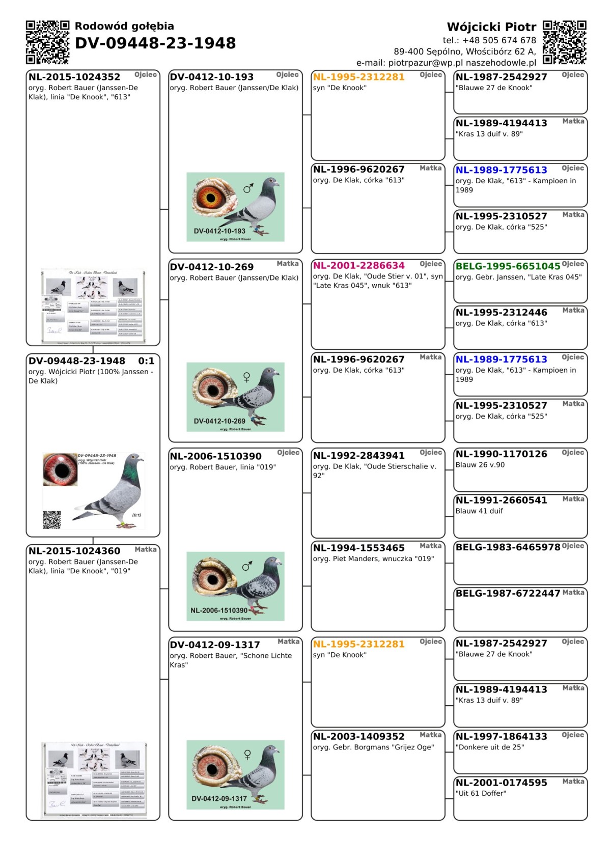 oryg. Wójcicki Piotr (100% Janssen - De Klak) Szczegóły pochodzenia w rodowodzie i załączonych materiałach. Więcej informacji o gołębiu i transporcie pod nr tel.: 505 674 678.