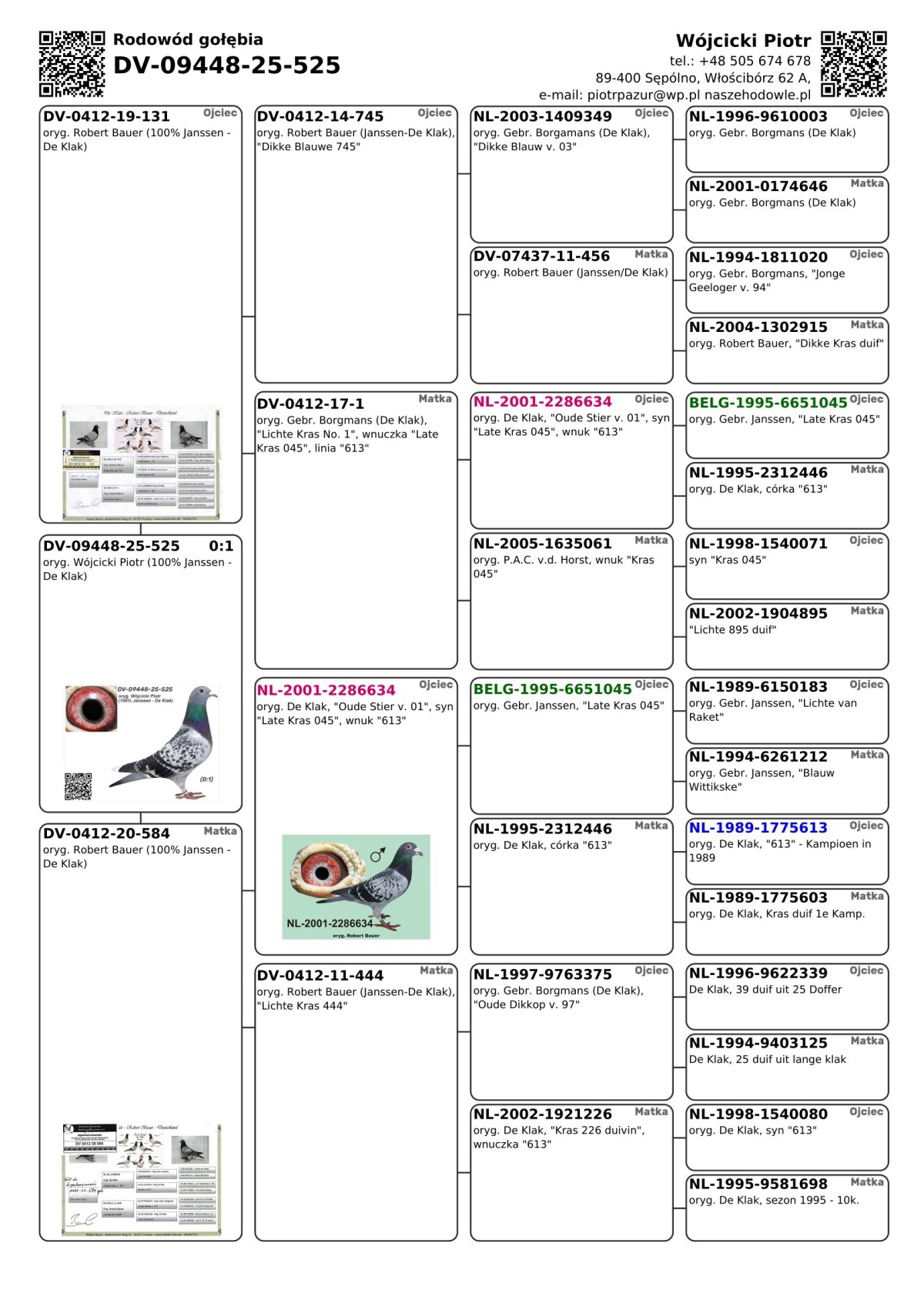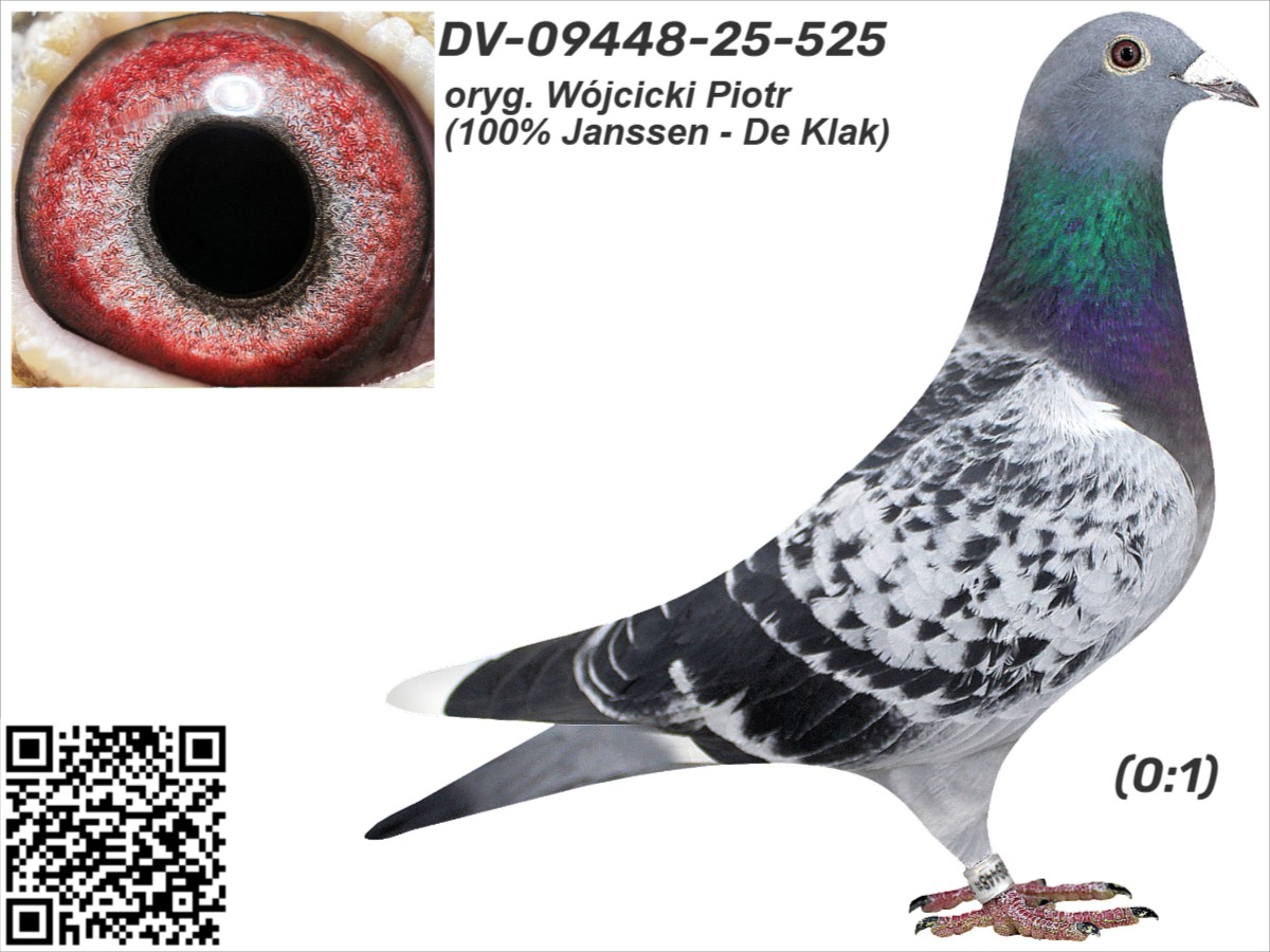 oryg. Wójcicki Piotr (100% Janssen - De Klak) Szczegóły pochodzenia w rodowodzie i załączonych materiałach. Więcej informacji o gołębiu i transporcie pod nr tel.: 505 674 678.