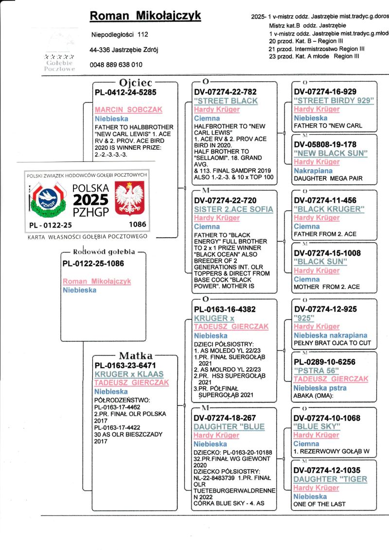 Gołąb z hodowli Romana Mikołajczyka. Szczegóły pochodzenia w rodowodzie. Kontakt w sprawie gołębi oraz transportu pod numerem telefonu +48 889 638 010
