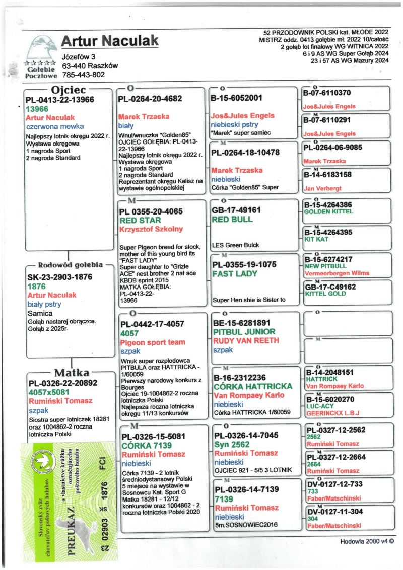 Oryginalny gołąb z hodowli Artura Naculaka. Szczegóły pochodzenia w rodowodzie. Więcej informacji pod nr tel.: 785443802